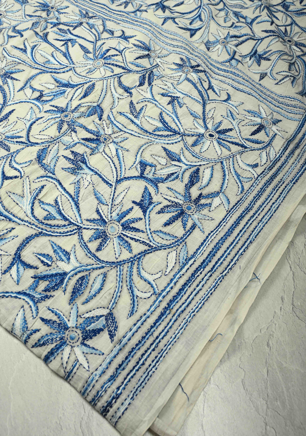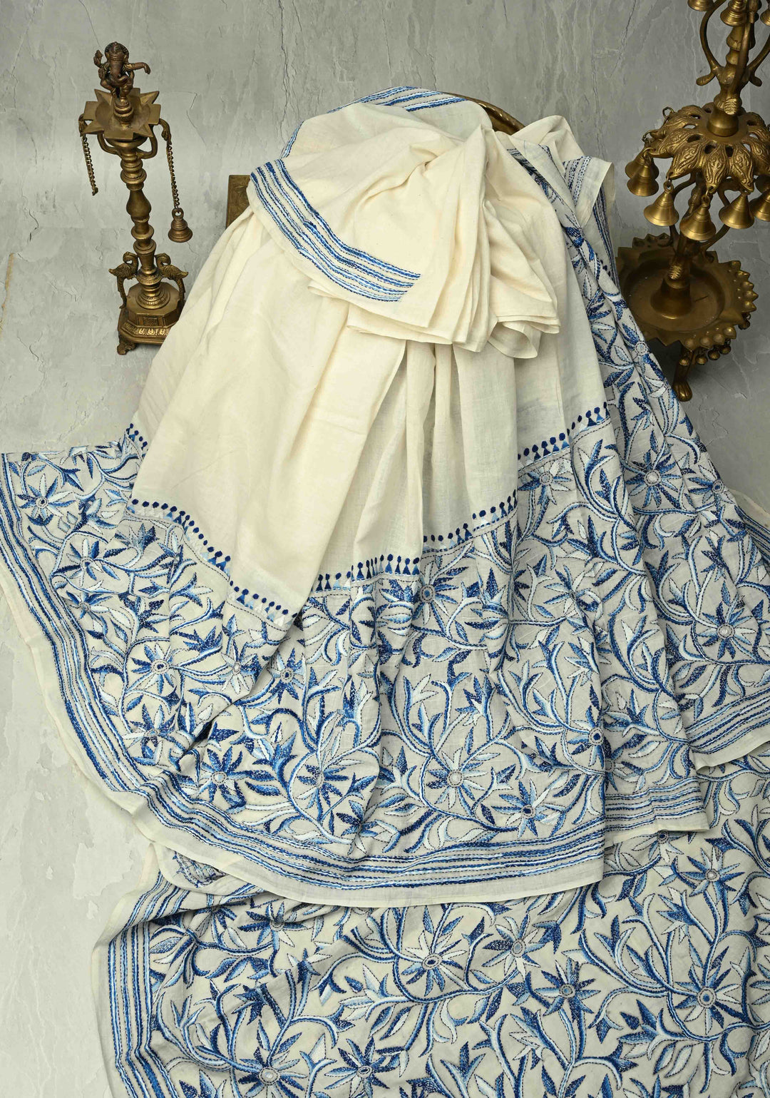 Off white Nakshi Kantha Embroidery on Cotton Saree with rising Border