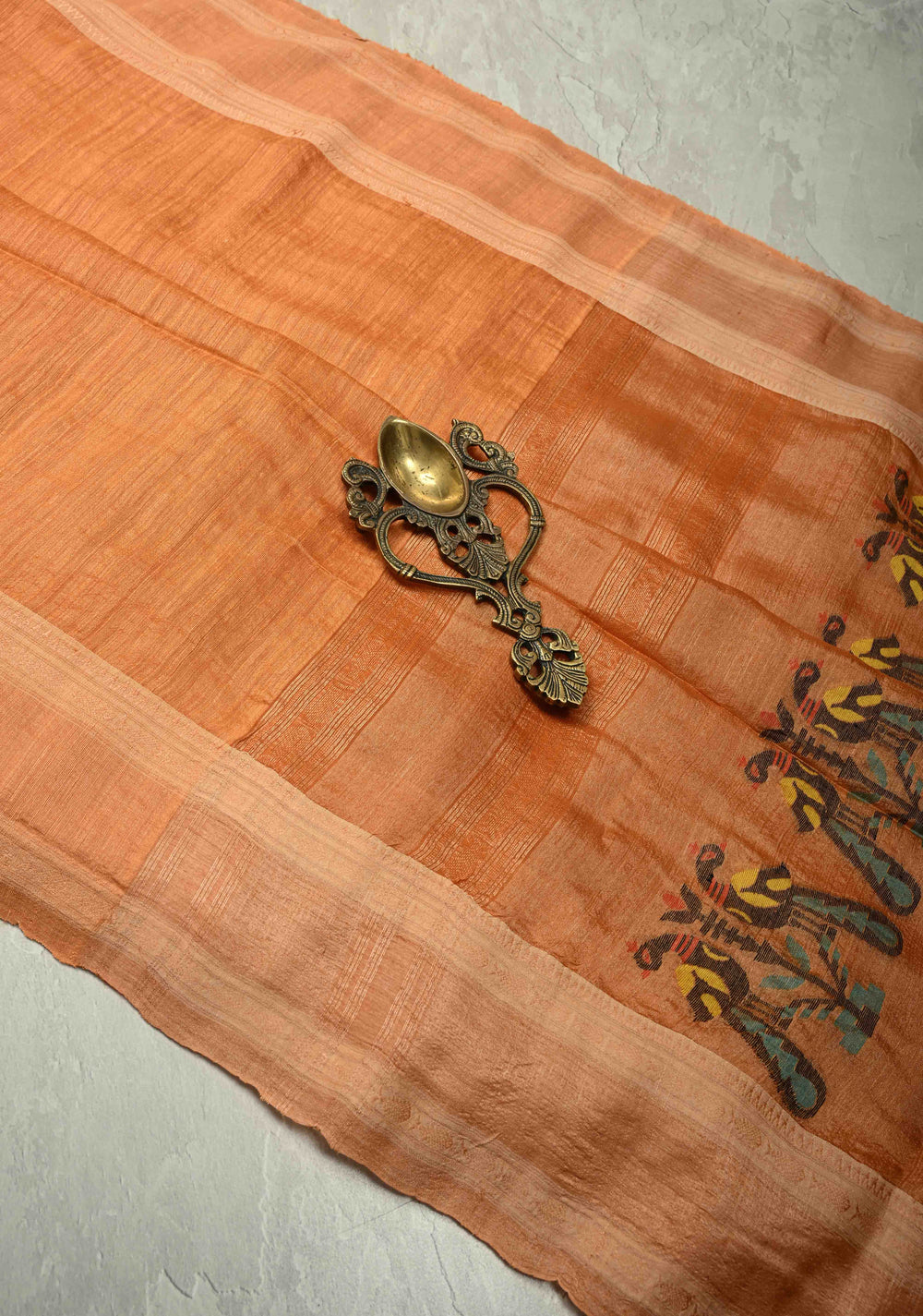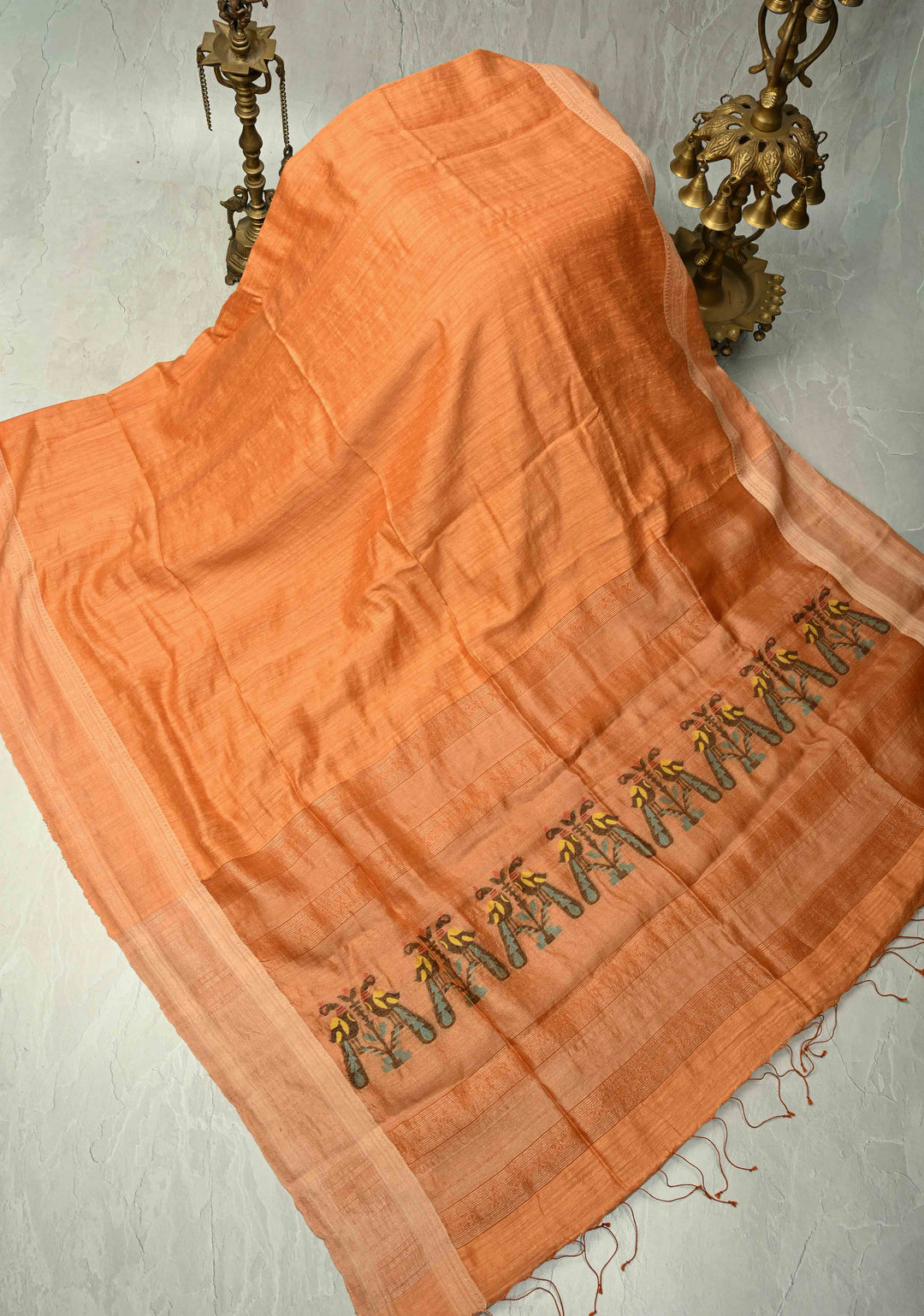 Peach Orange Geecha Tussar Silk Saree with Jamdani Style Parrot Pallu and Stack Border | SILK MARK CERTIFIED