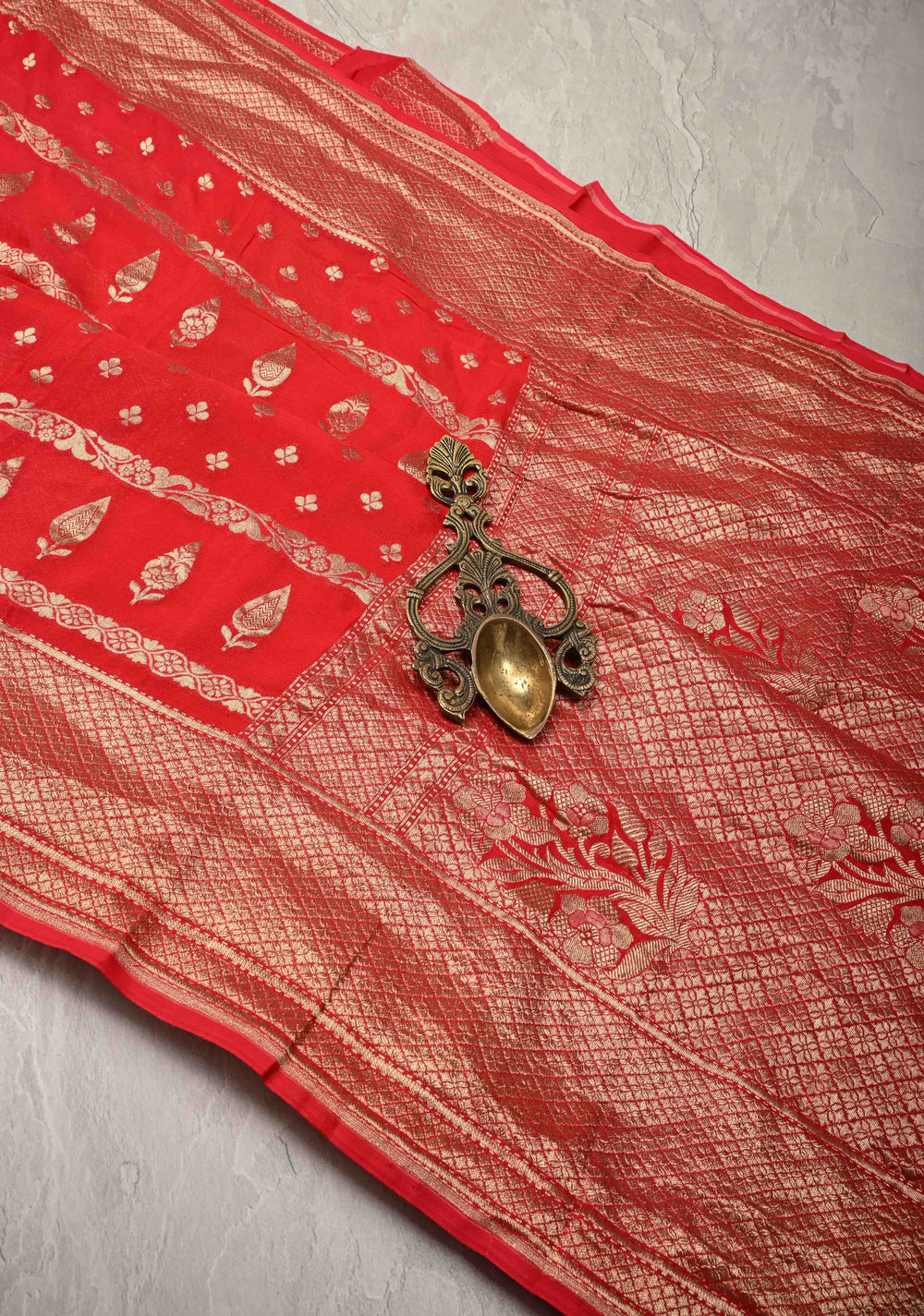 Red Banarasi chiffon Silk Saree with zari border and Paisley Pallu | SILK MARK CERTIFIED