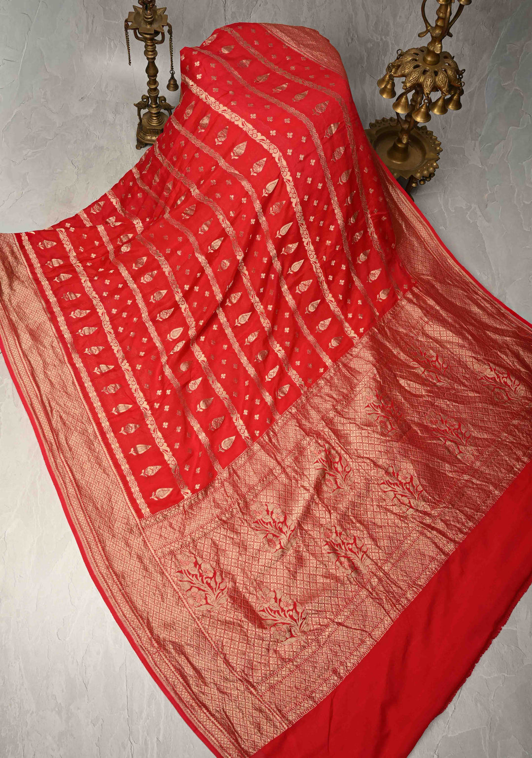 Red Banarasi Semi Mashru Silk Saree with Floral Zari Butta and Vine floral Zari Border