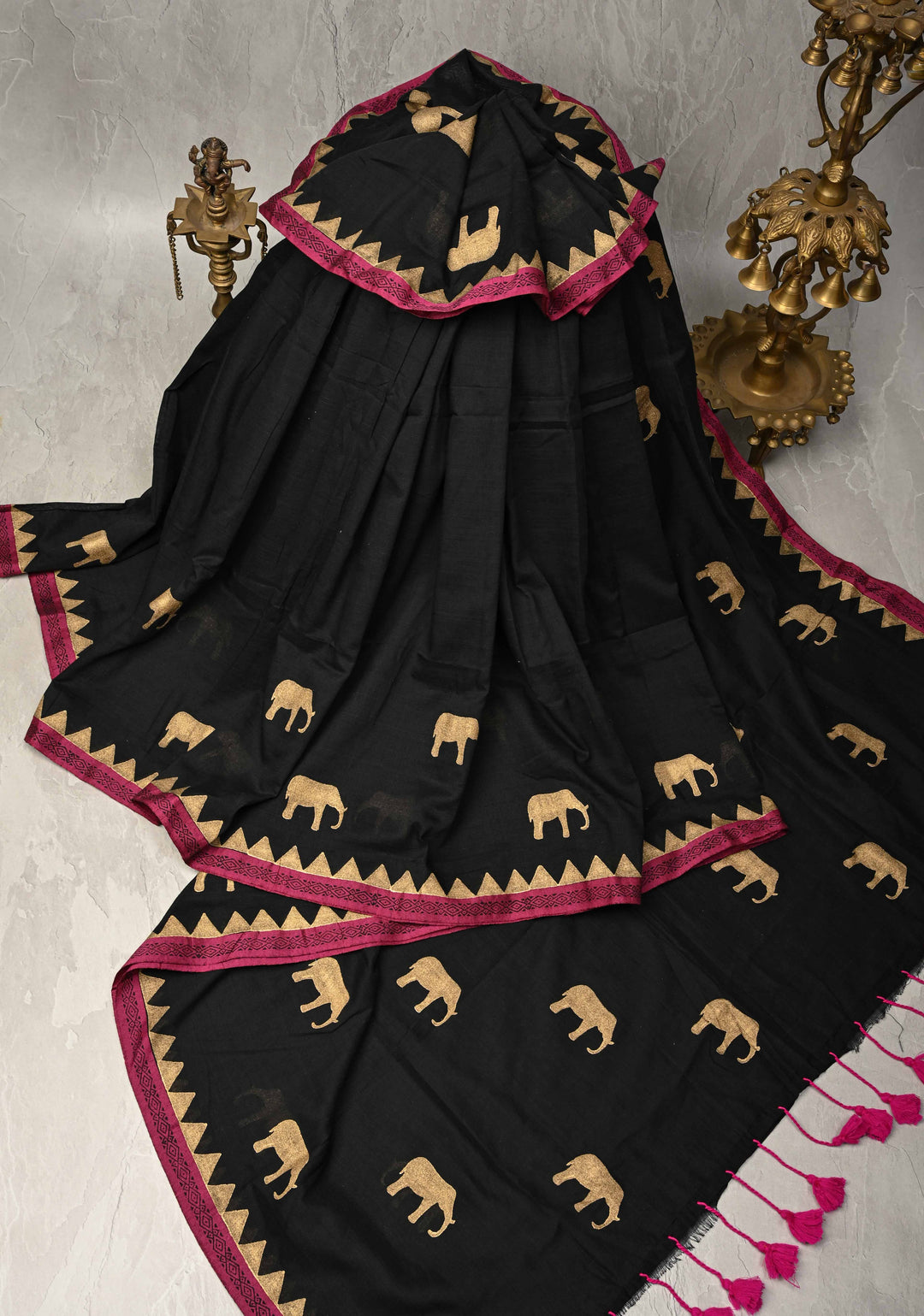 Black Uppada Cotton Saree with Elephant Block Print Buttas and Contrast Minimal Temple Border, Long Tassels