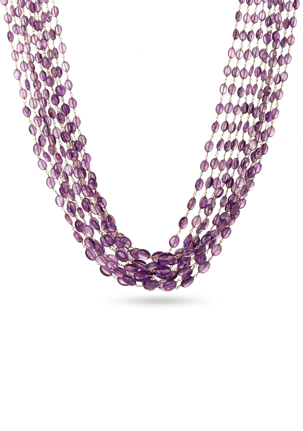 Indulge in ultimate luxury with this 925 Silver Amethyst Multistrand beads necklace. Crafted with all natural Amethyst stones that are string with 92.5 silver wires micro plated in 24 Kt gold, this necklace is sure to elevate any outfit. With its charming color and composition, Upgrade your accessory game with this exclusive piece.