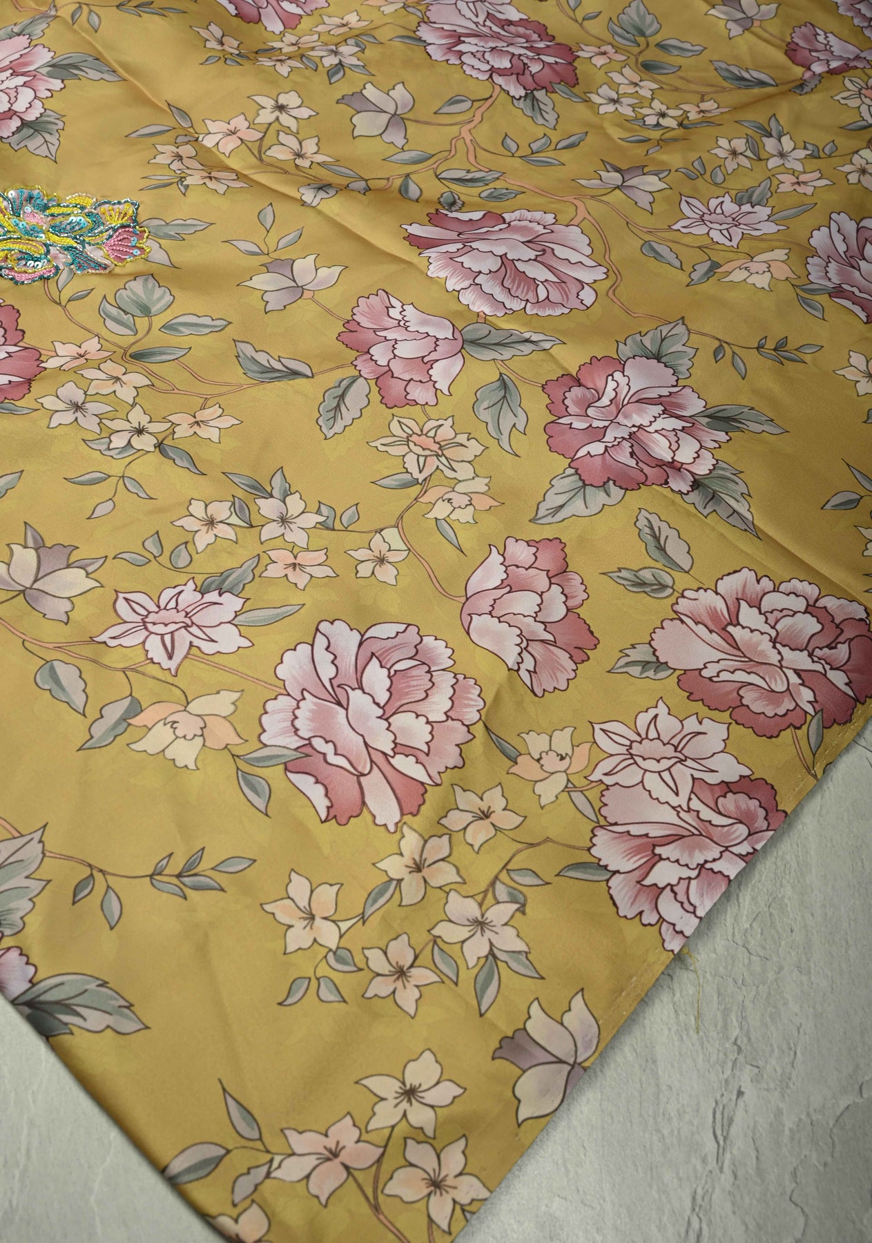 Drench yourself in the subtle radiance of this matte yellow satin silk saree. The soft, non-glossy finish of the satin silk lends an air of understated elegance, while the vibrant floral digital print bursts across the fabric, creating a contemporary and artistic appeal. Adding a touch of exquisite detailing are delicate embellishments of shimmering sequins, intricate cutdana work, and fine hand embroidery, strategically placed to highlight the beauty of the floral motifs and add a touch of texture and sparkle. The smooth drape of the satin silk enhances the vibrancy of the print and the delicate embellishments, making this saree a perfect choice for daytime events, social gatherings, and occasions where you want to showcase a blend of modern design and traditional craftsmanship with a touch of subtle glamour.