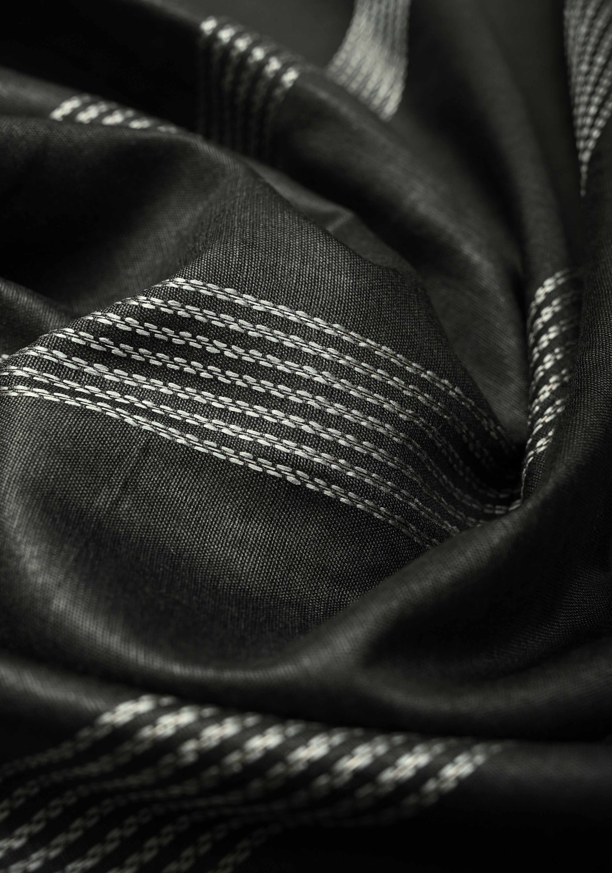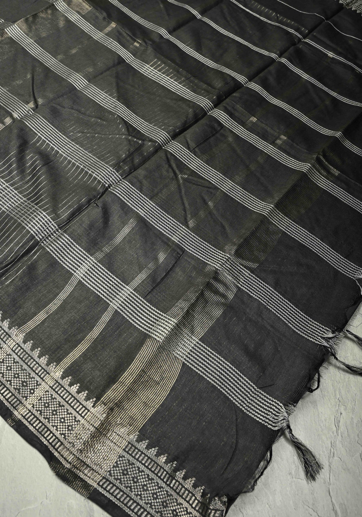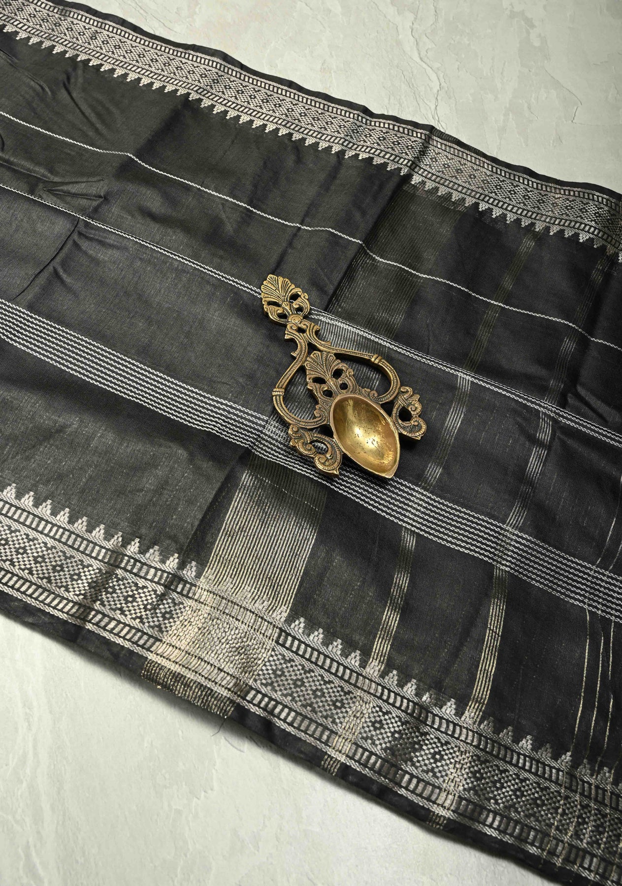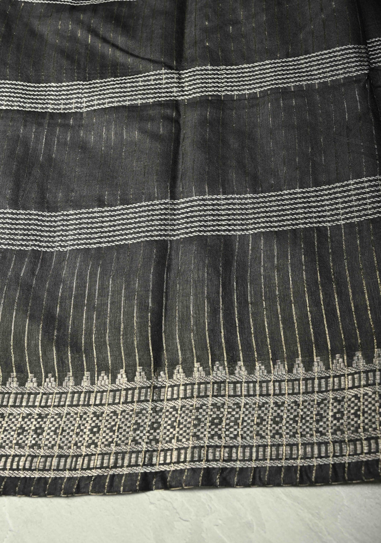 Elevate your traditional wardrobe with this Black Semi Tussar Saree, crafted from soft, breathable semi-tussar fabric that drapes beautifully with a subtle sheen. The deep black body is adorned with delicate thread stripes, adding a modern, elegant texture. A stunning temple-inspired zari border enhances the saree with intricate detailing, blending heritage motifs with contemporary style. Perfect and cultural events, this saree is lightweight, graceful, and effortlessly sophisticated.