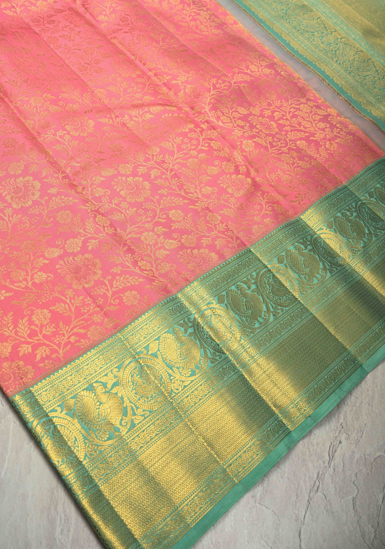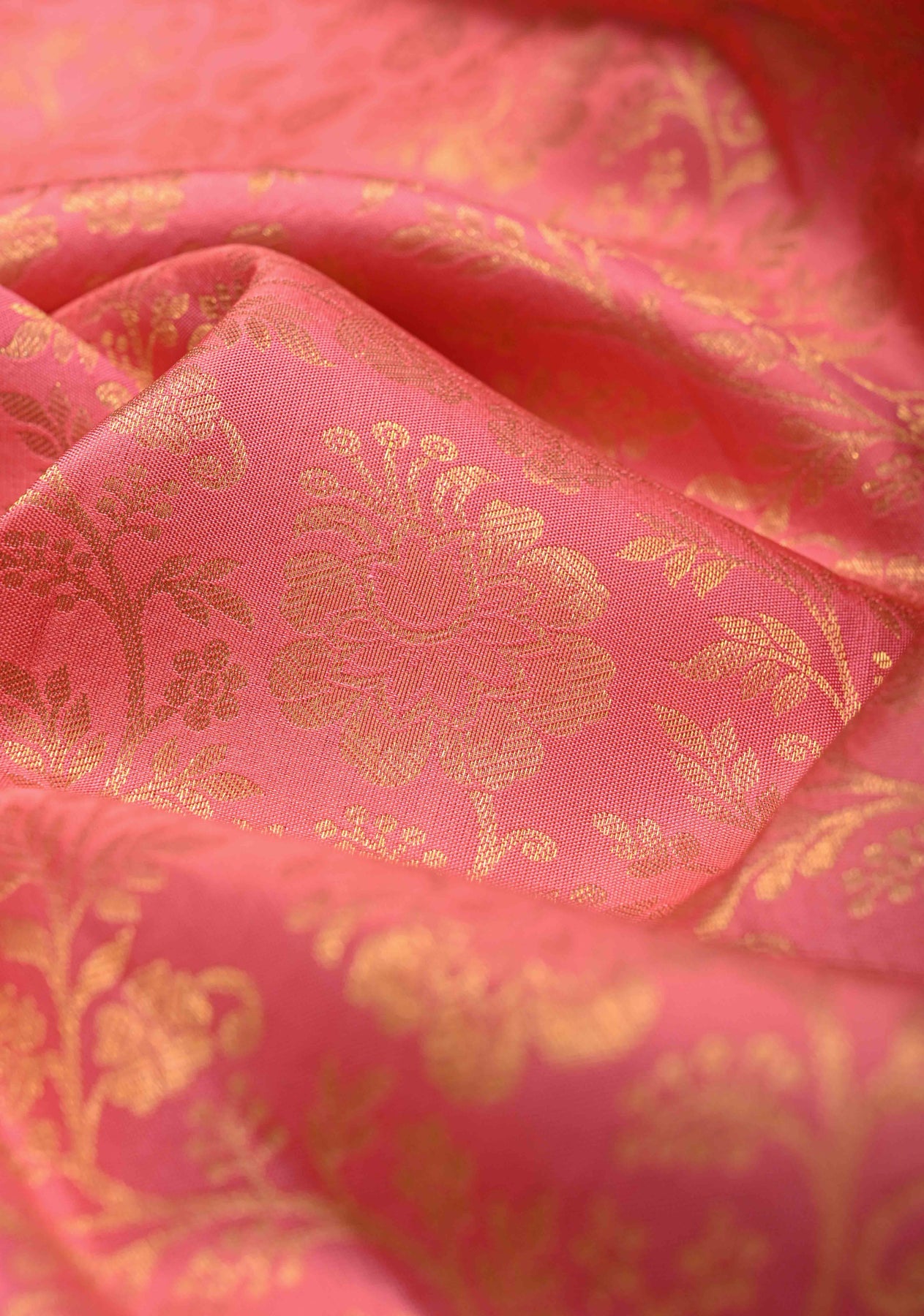 The Bright Pink Pure Kanjivaram Silk Saree is a vibrant celebration of traditional craftsmanship and timeless elegance. Woven from pure Kanjivaram silk, this saree features a striking bright pink hue that radiates charm and sophistication. The body is adorned with intricate floral zari brocade jaal, reflecting exquisite artistry and attention to detail. A contrast zari border frames the saree beautifully, adding regal refinement and enhancing its classic appeal. Perfect for weddings, festive occasions, and grand celebrations, this saree is a statement and grace.