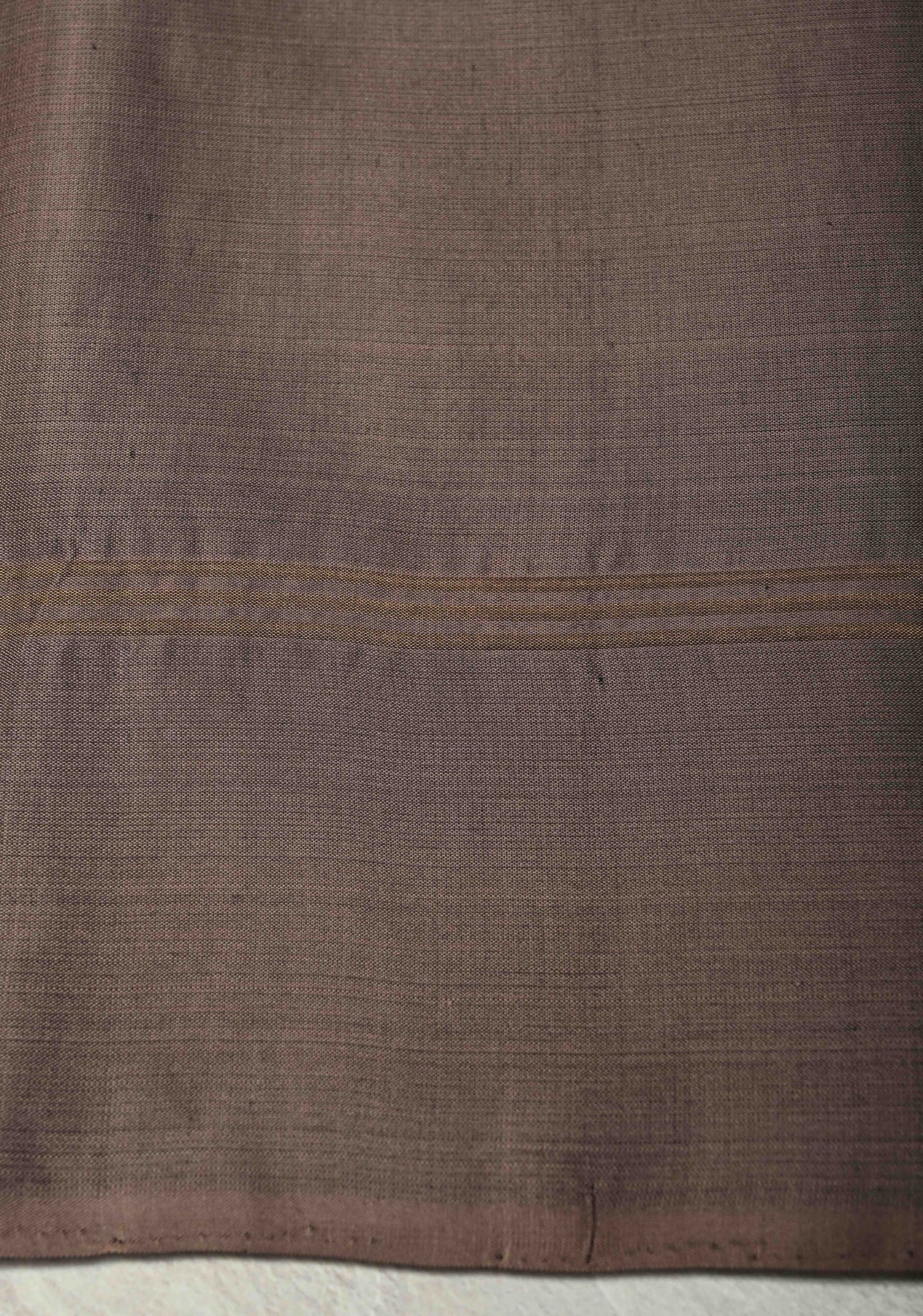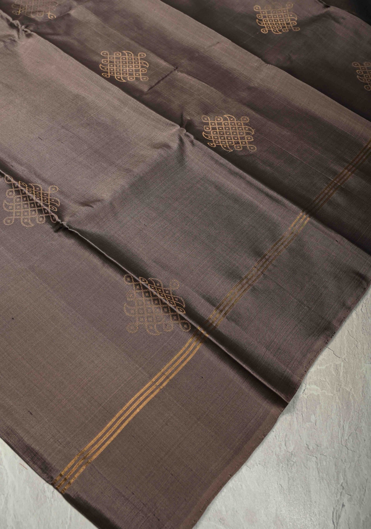 This Brownish Gray Handloom Pure Silk Kanchi Saree is a timeless piece that blends tradition with understated elegance. The brown-gray hue provides a sophisticated canvas for the intricate Kolam buttas, which are delicately woven across the body in rich zari. The Kolam motifs, inspired by traditional South Indian art forms, add an element of grace and artistry. The saree is finished with a matching border that complements the design and enhances its regal appeal. Ideal for weddings, cultural events, and festive occasions, this saree exudes a quiet yet captivating charm.