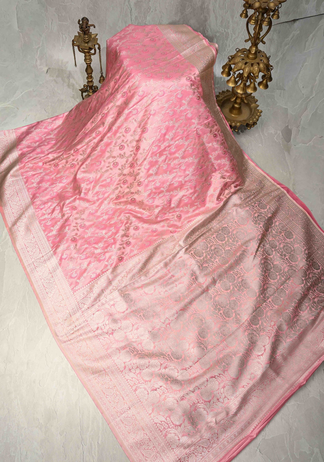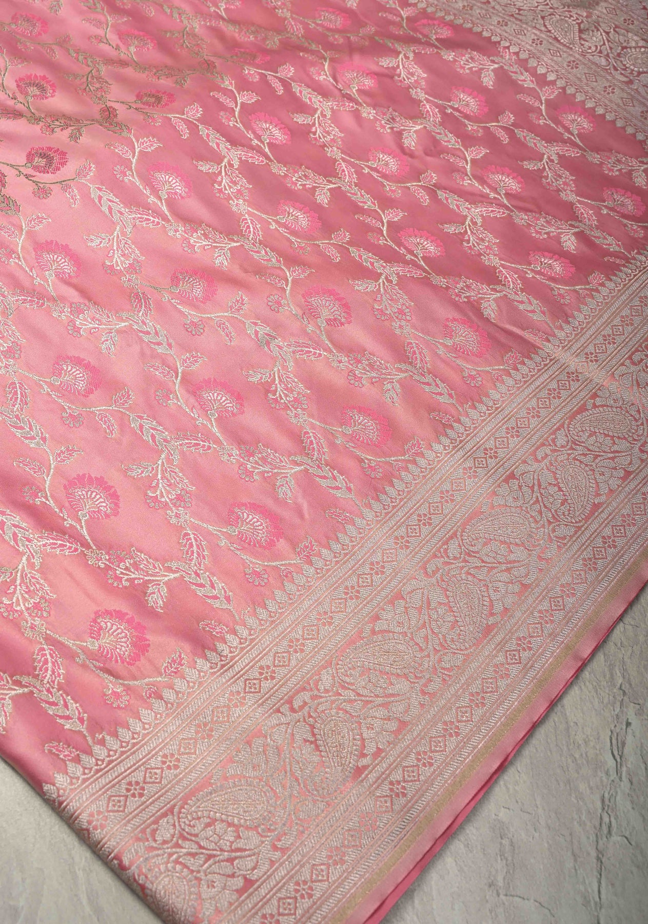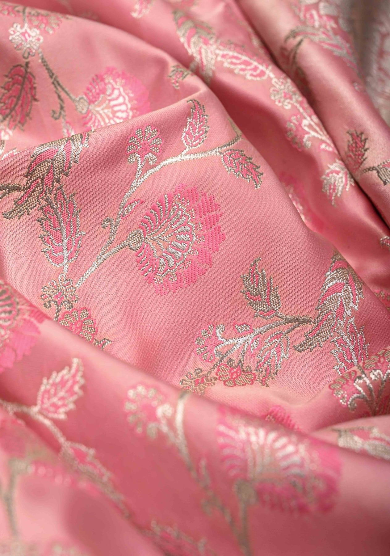 The Dusty Rose Banarasi Semi Mashru Silk Saree is a graceful blend of classic Banarasi artistry and modern elegance. Crafted from Banarasi semi mashru silk, this saree features a soft dusty rose hue that exudes subtle sophistication. The body is beautifully adorned with intricate Meenakari silver zari floral jaal, adding delicate detailing and a gentle shimmer. A timeless zari border completes the design, enhancing its traditional appeal. Smooth, lustrous, and elegant, this saree is perfect for weddings, festive celebrations, and special occasions.