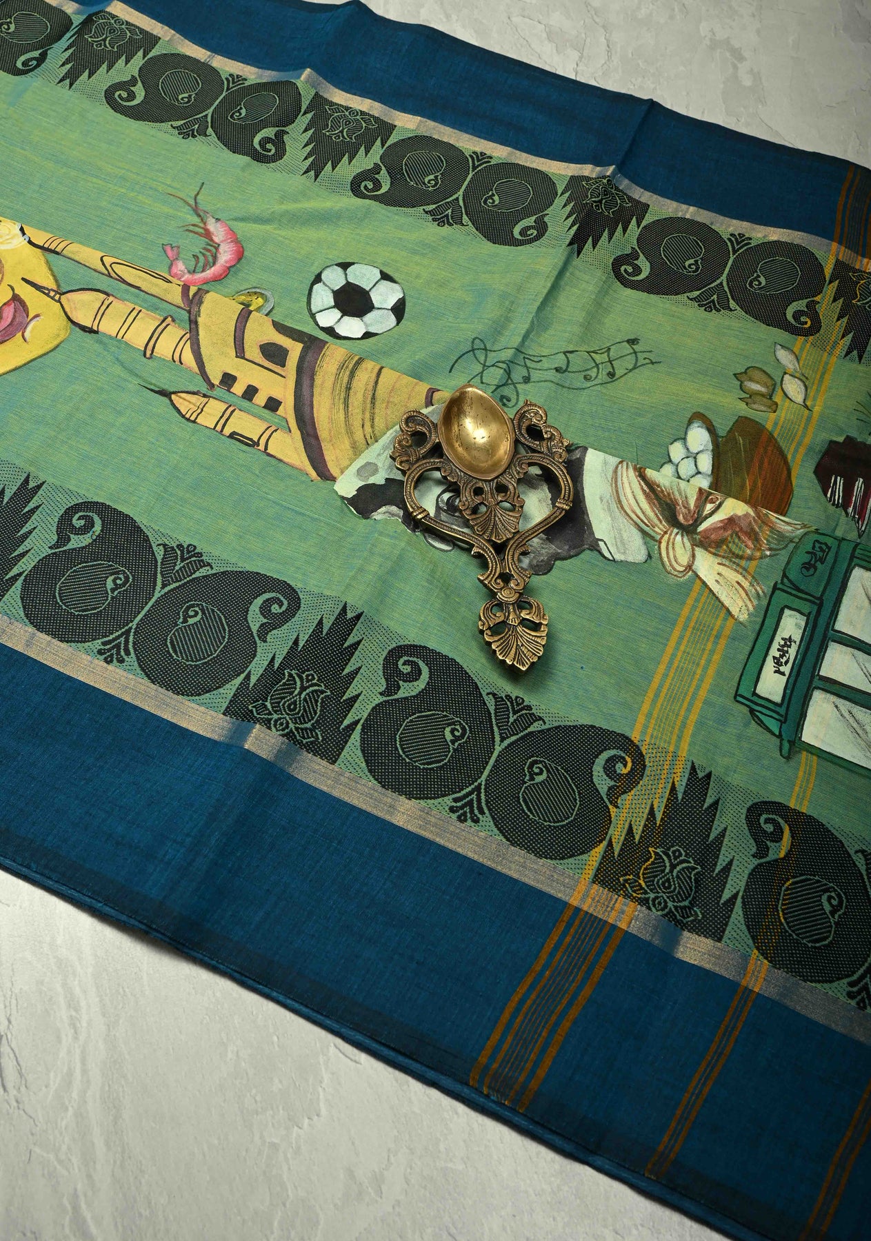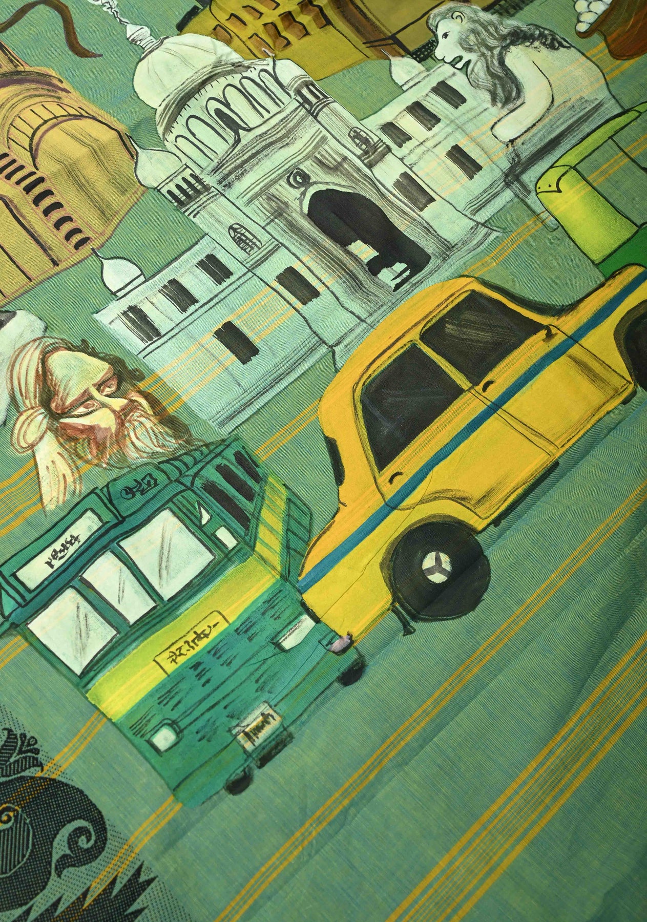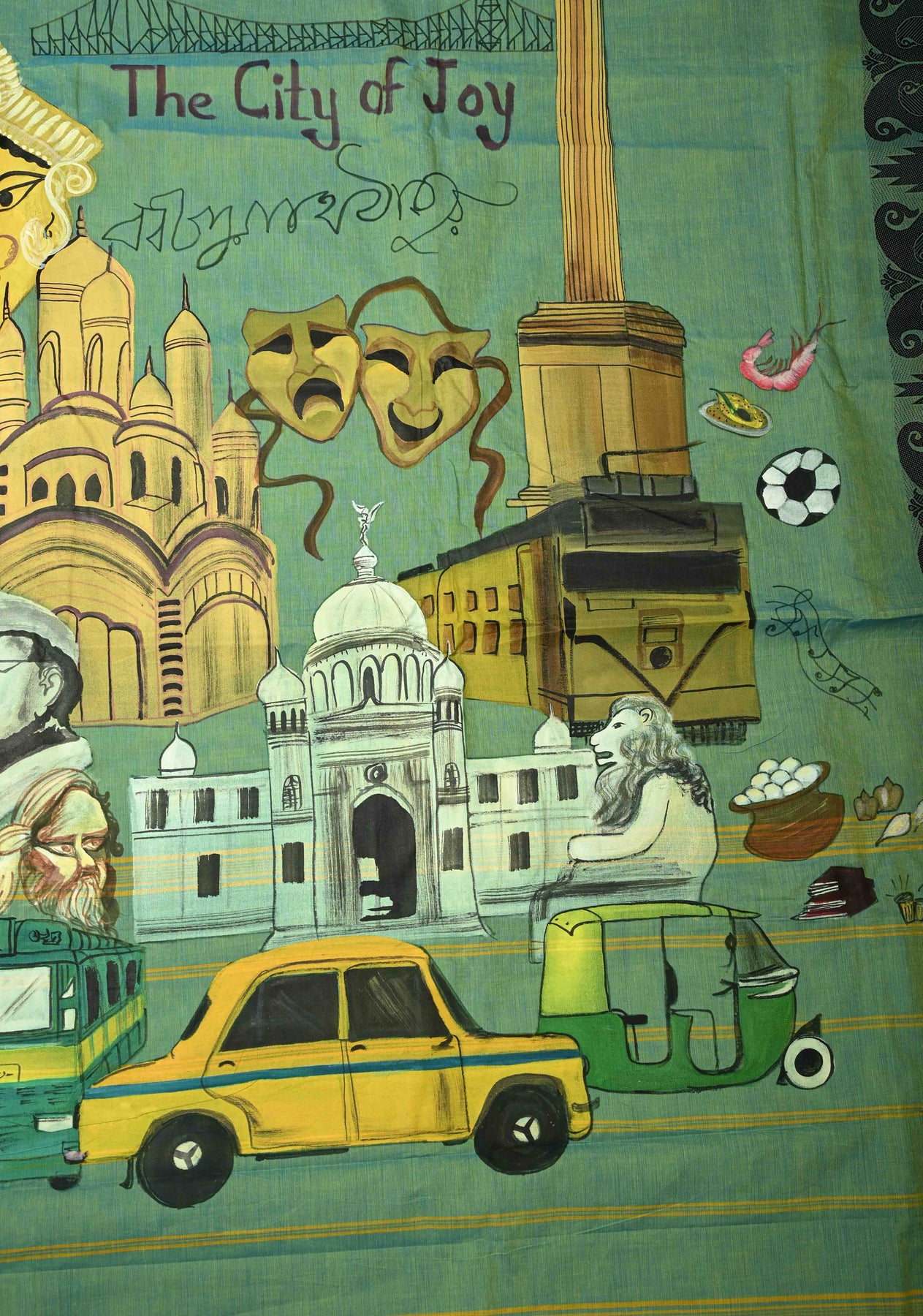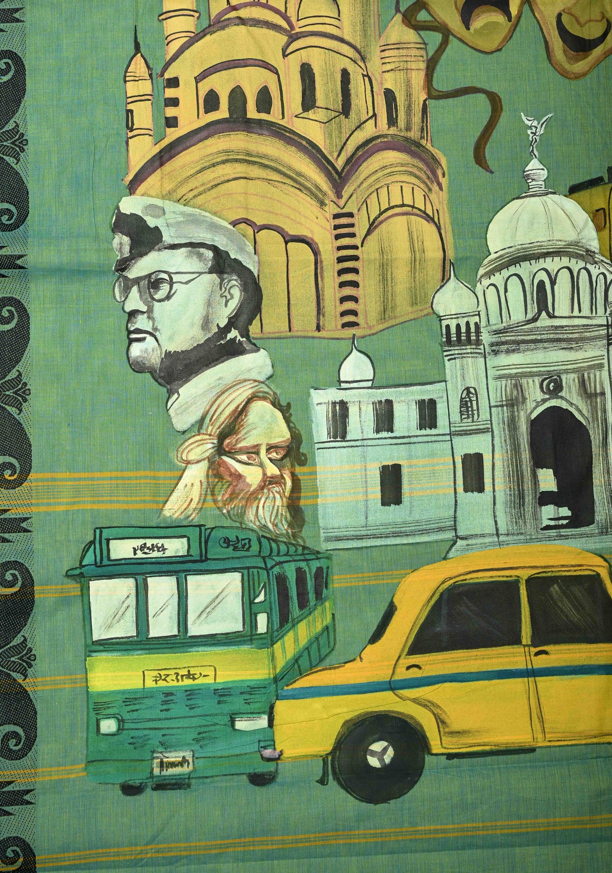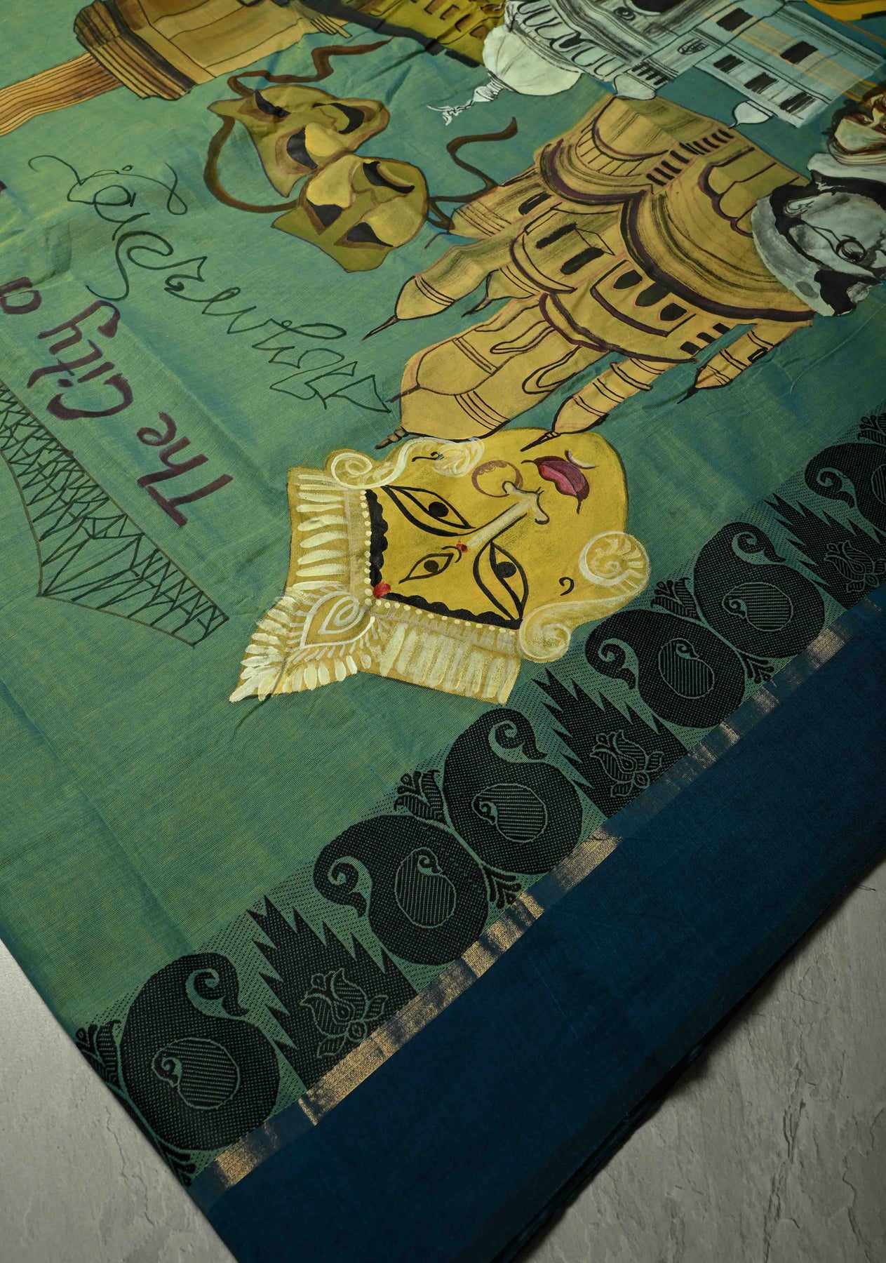 This Green Dual Tone Narayanpet Cotton Saree is a perfect blend of traditional craftsmanship and contemporary artistry. The soothing green dual-tone body is paired with a unique hand-painted pallu inspired by the vibrant “City of Joy” – Kolkata, capturing iconic landmarks and the city’s cultural essence in intricate detail. Crafted from soft, breathable Narayanpet cotton, the saree drapes effortlessly, offering comfort while making a bold artistic statement. Ideal for festive occasions, cultural events, or casual celebrations, it’s a wearable tribute to heritage and creativity.