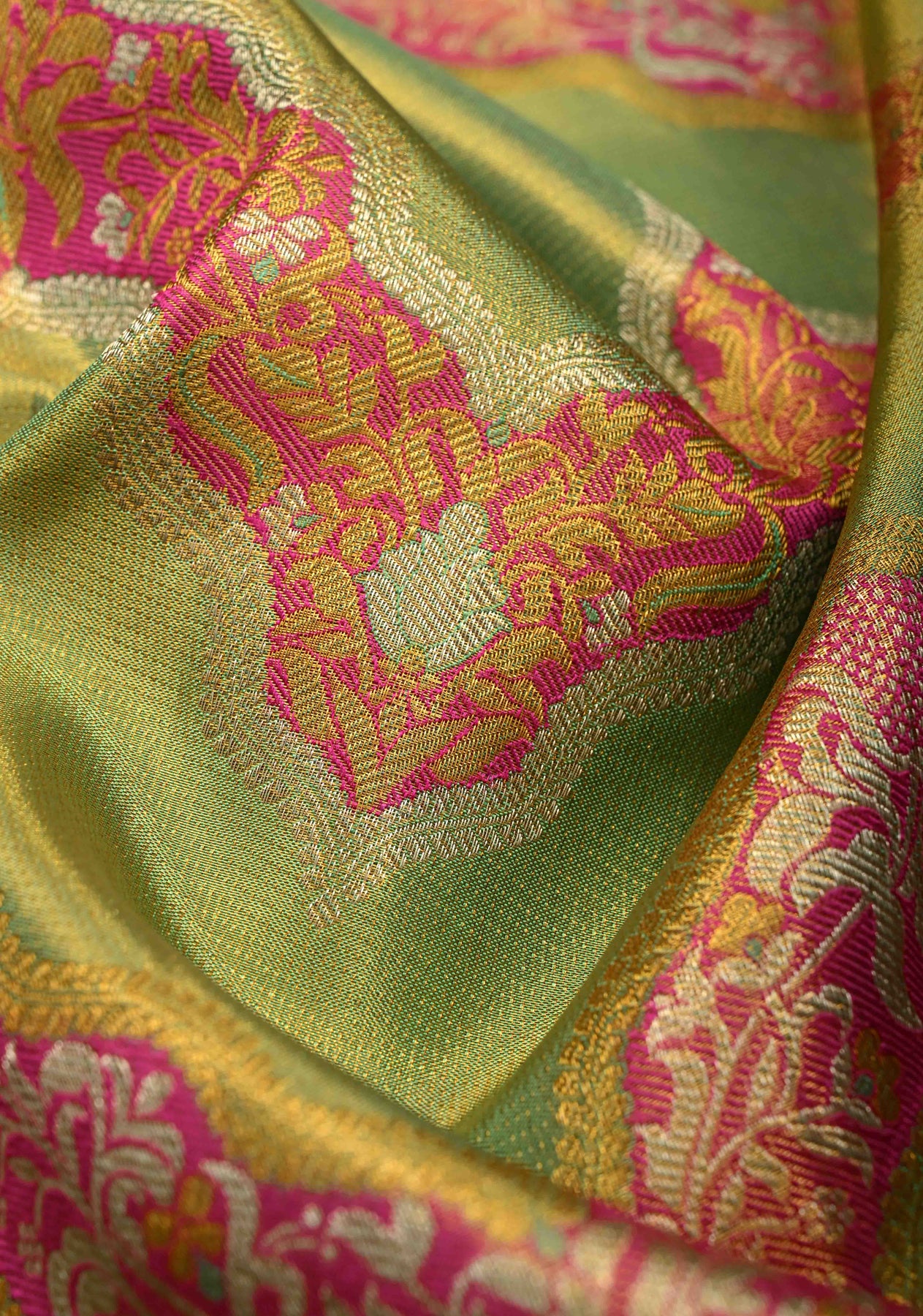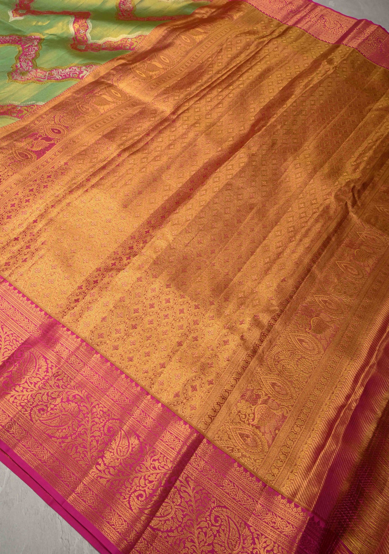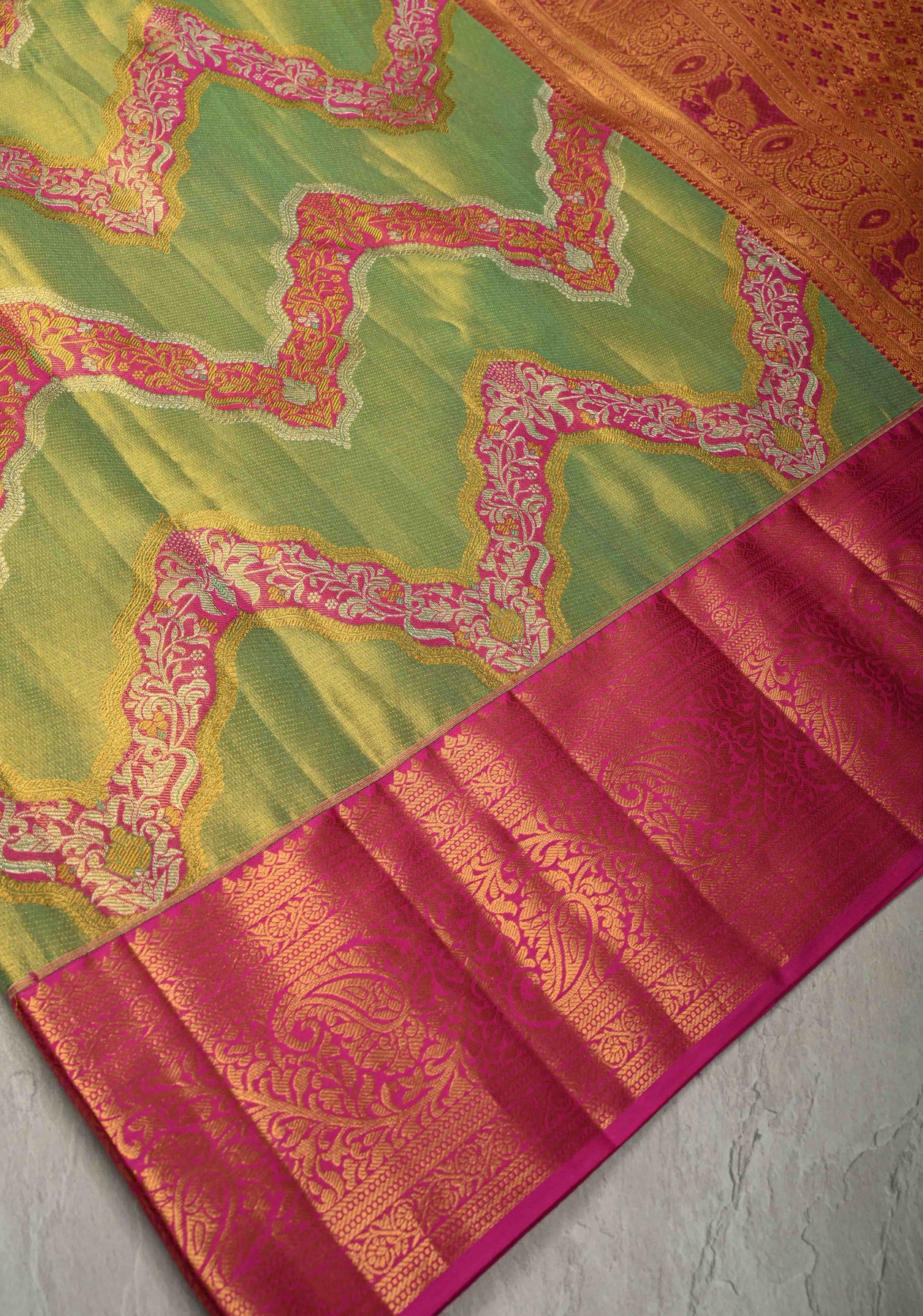 Step into a world of vibrant heritage with our Green Pure Kanjivaram Tissue Silk Saree. This stunning drape features a rare Meenakari Leheria design, where colorful silken threads are intricately woven into a wave-like pattern across a luminous tissue base. The radiant green hue is perfectly framed by a traditional Zari border, blending high-shine glamour with artisanal precision. Lightweight and opulent, it is the ultimate statement piece for weddings and festive celebrations.