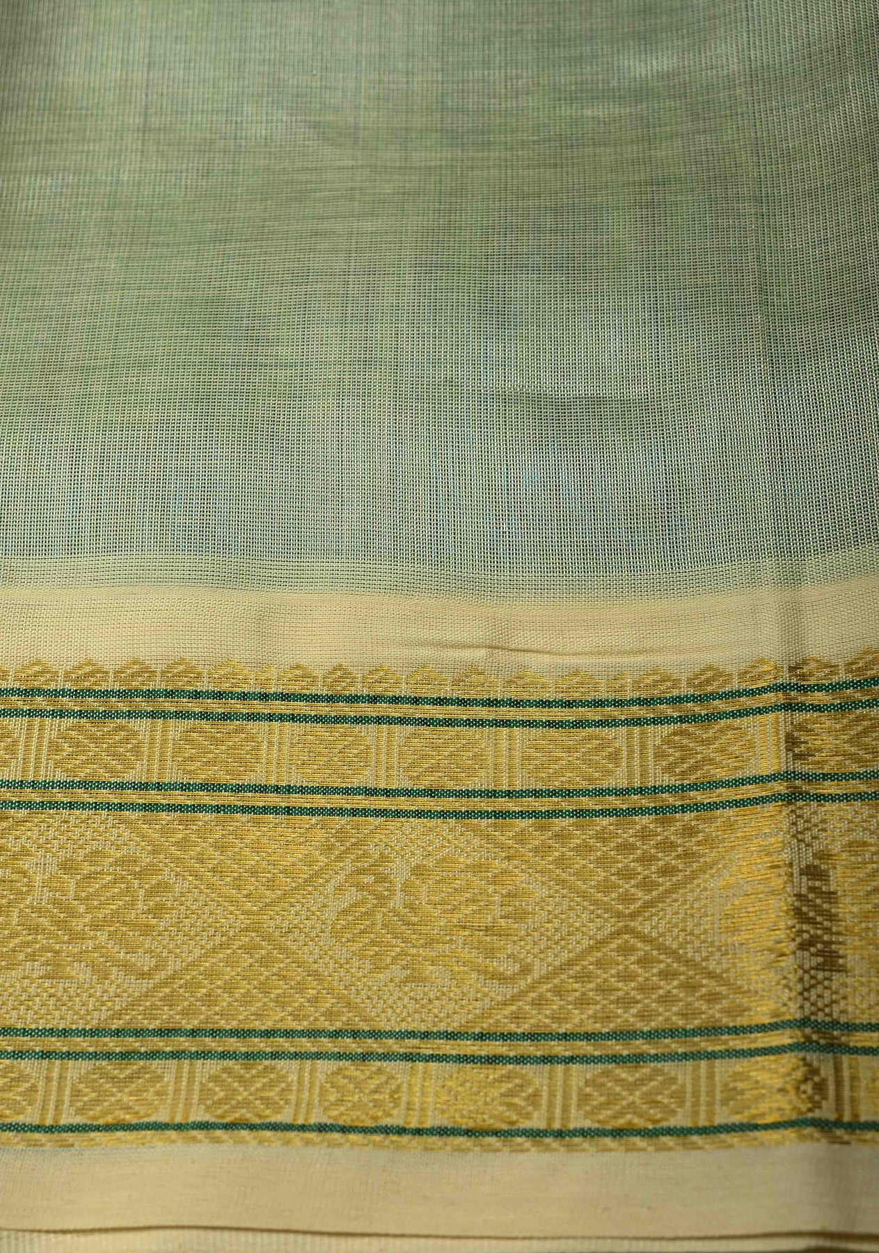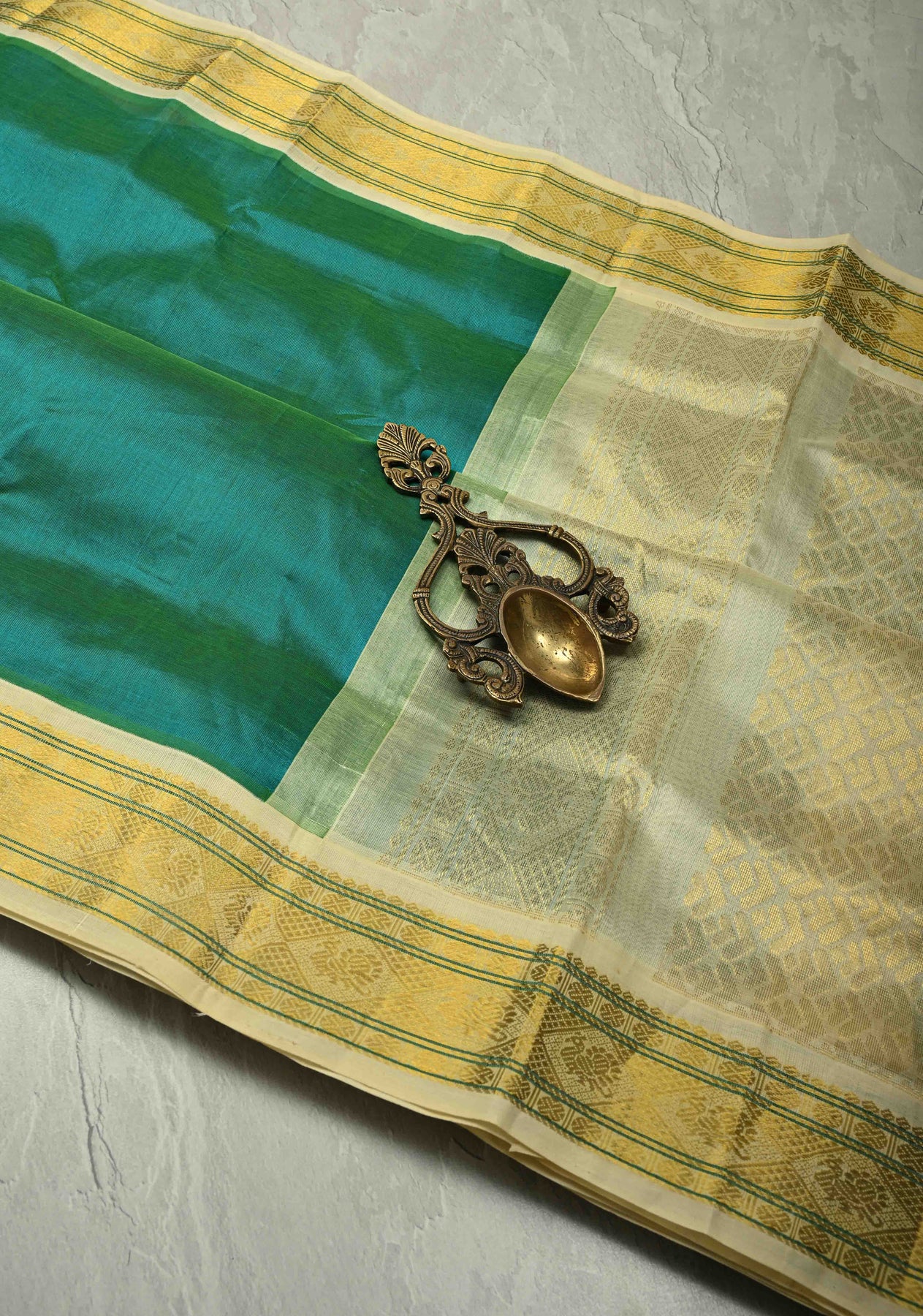Elegant and timeless, this Blue-Green Dual Tone Kanchi Silk Cotton Saree is a true masterpiece of South Indian handloom tradition. Woven entirely by hand, the 100% Kanchi silk-cotton blend delivers a rich texture with a gentle sheen and a structured yet breathable drape. The captivating dual-tone effect of blue and green shifts beautifully in light, creating a regal and dynamic appearance. Finished with a subtle and sophisticated off-white zari border, this saree is perfect for traditional functions, festive occasions, or graceful everyday elegance.