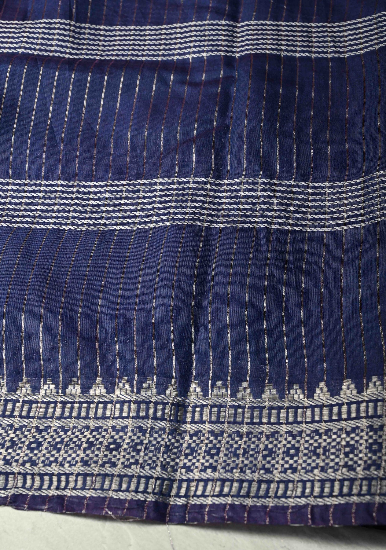 This Ink Purple Semi Tussar Saree exudes understated elegance with its rich, deep hue and intricate detailing. Made from semi-tussar silk, it offers a luxurious feel while maintaining a lightweight, breathable quality. The saree features delicate thread stripes woven into the fabric, adding a subtle texture and a modern twist to the traditional design. The zari border is a striking contrast, glimmering with intricate gold or silver threadwork, which enhances the overall appeal. The combination of the deep ink purple shade with the understated stripes and ornate border makes it a versatile choice for both formal occasions and festive celebrations, offering a blend of tradition and contemporary style