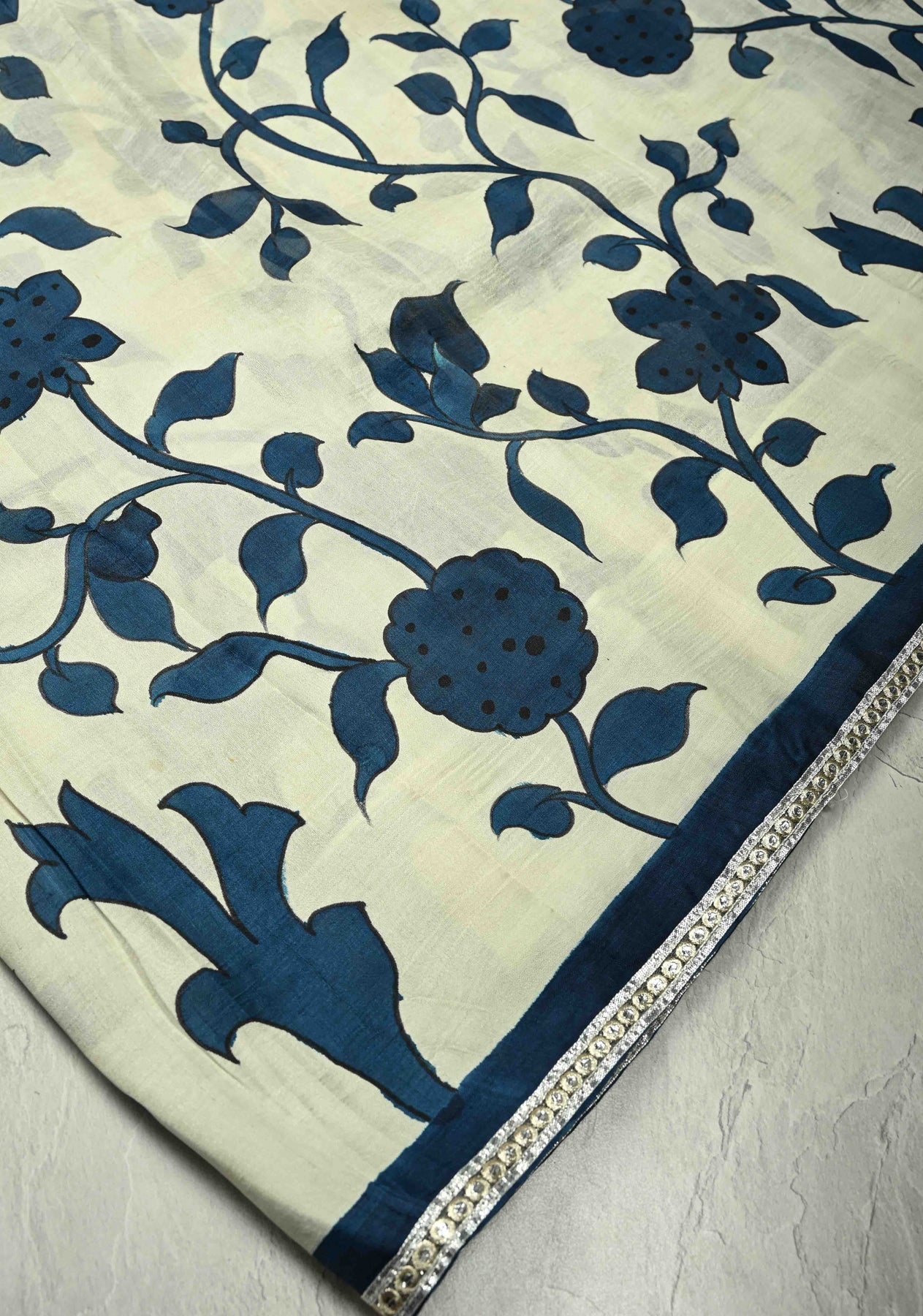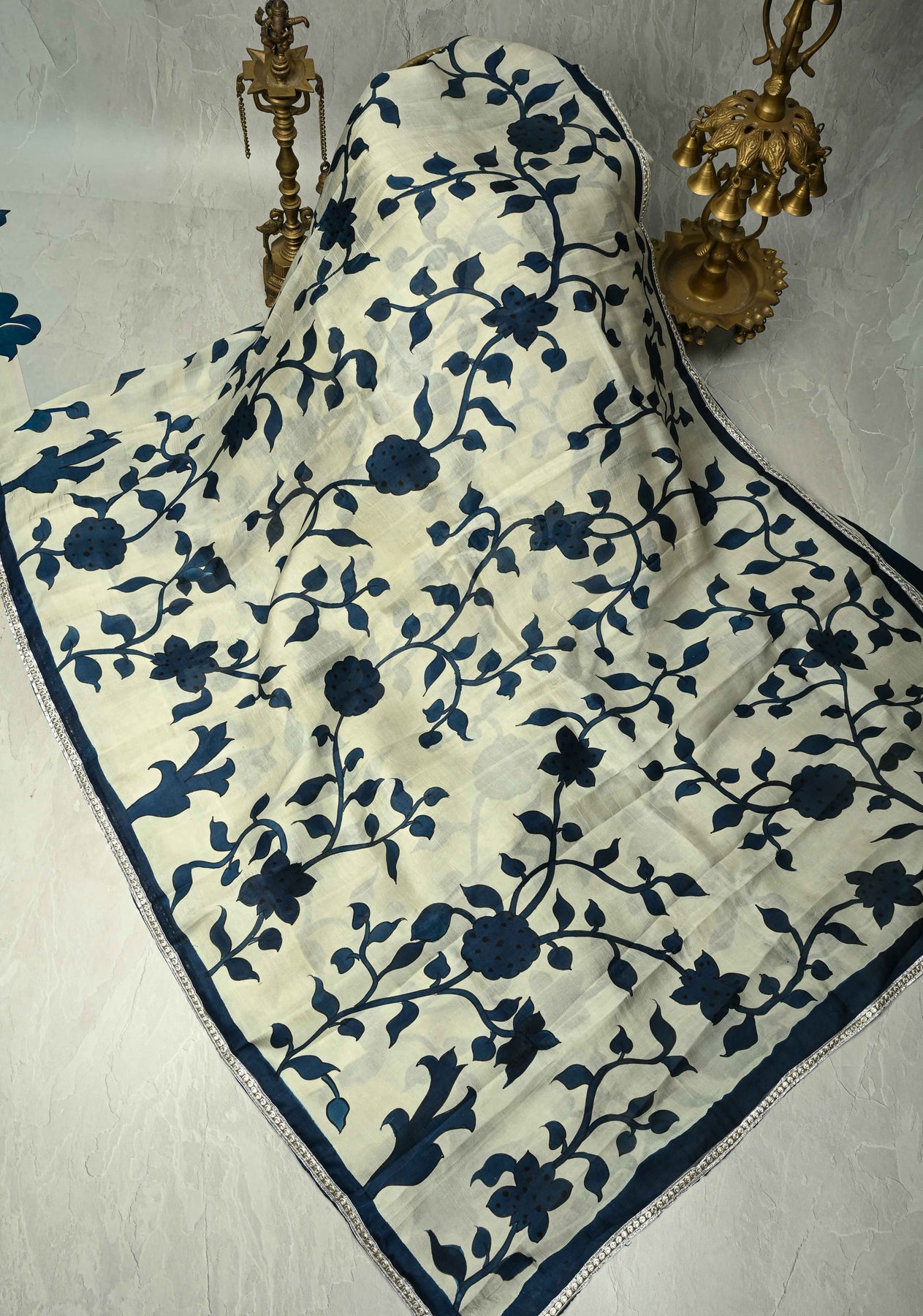 This Ivory Pure Handloom Tussar Silk Saree exudes understated elegance and timeless beauty. Crafted from handloom tussar silk, the saree features a rich, textured fabric that drapes effortlessly, adding a sophisticated charm to any occasion. The saree is adorned with delicate floral handpainted designs, each brushstroke carefully applied to create a graceful and artistic pattern. The intricate lace border enhances the overall look, adding a refined touch to the traditional silk weave. Ideal for weddings, festive gatherings, or formal events, this saree combines the allure of nature-inspired art with the luxurious feel of handloom tussar silk.