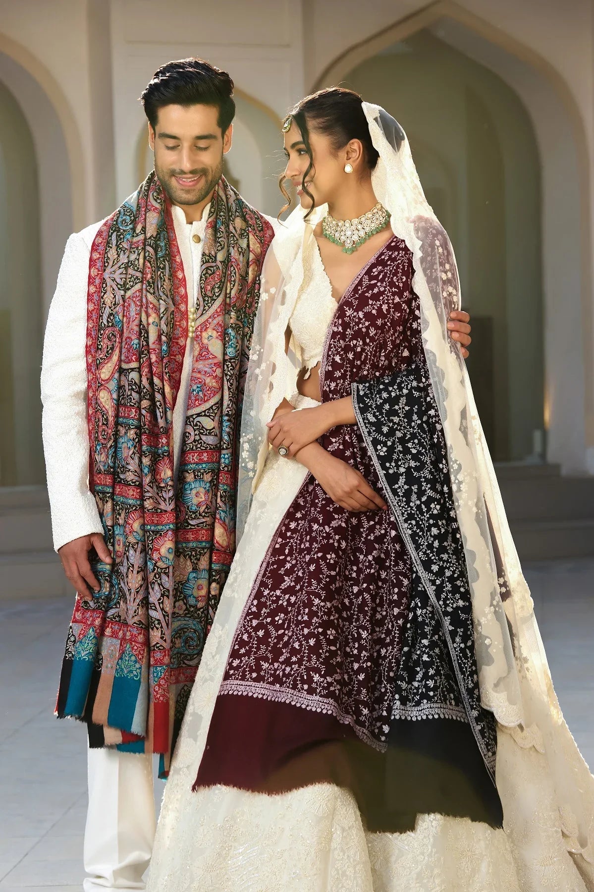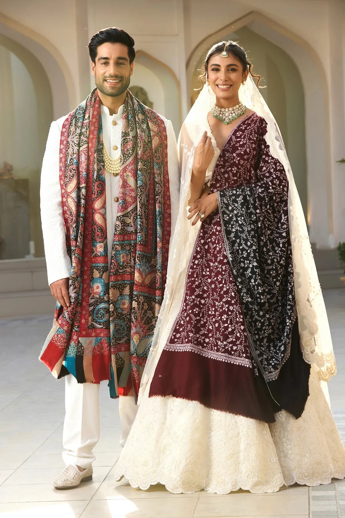 Indulge in vibrant luxury with the Manas Pashmina Shawl. Handwoven pashmina wool meets exquisite Kalamkari Adda work, creating a stunning shawl draped in silk stories. Soft, warm, and lightweight