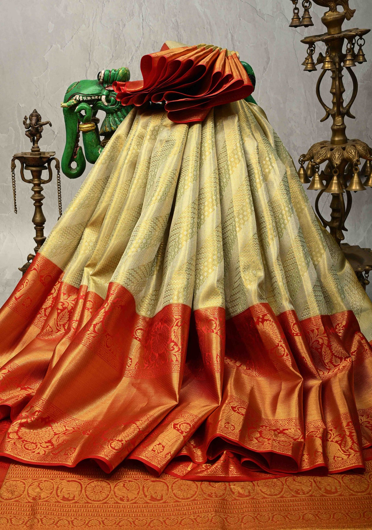 Radiate timeless grace in our Pista Green Pure Kanjivaram Tissue Silk Saree. This exquisite drape features a luminous metallic sheen, adorned with elegant diagonal stripes that elongate the silhouette. The masterpiece is defined by its magnificent wide zari border, showcasing intricate traditional motifs that exude royal grandeur. Handwoven from the finest silk, this lightweight yet opulent saree is perfect for weddings and high-profile festivities, offering a refreshing, sophisticated take on classic heritage luxury.