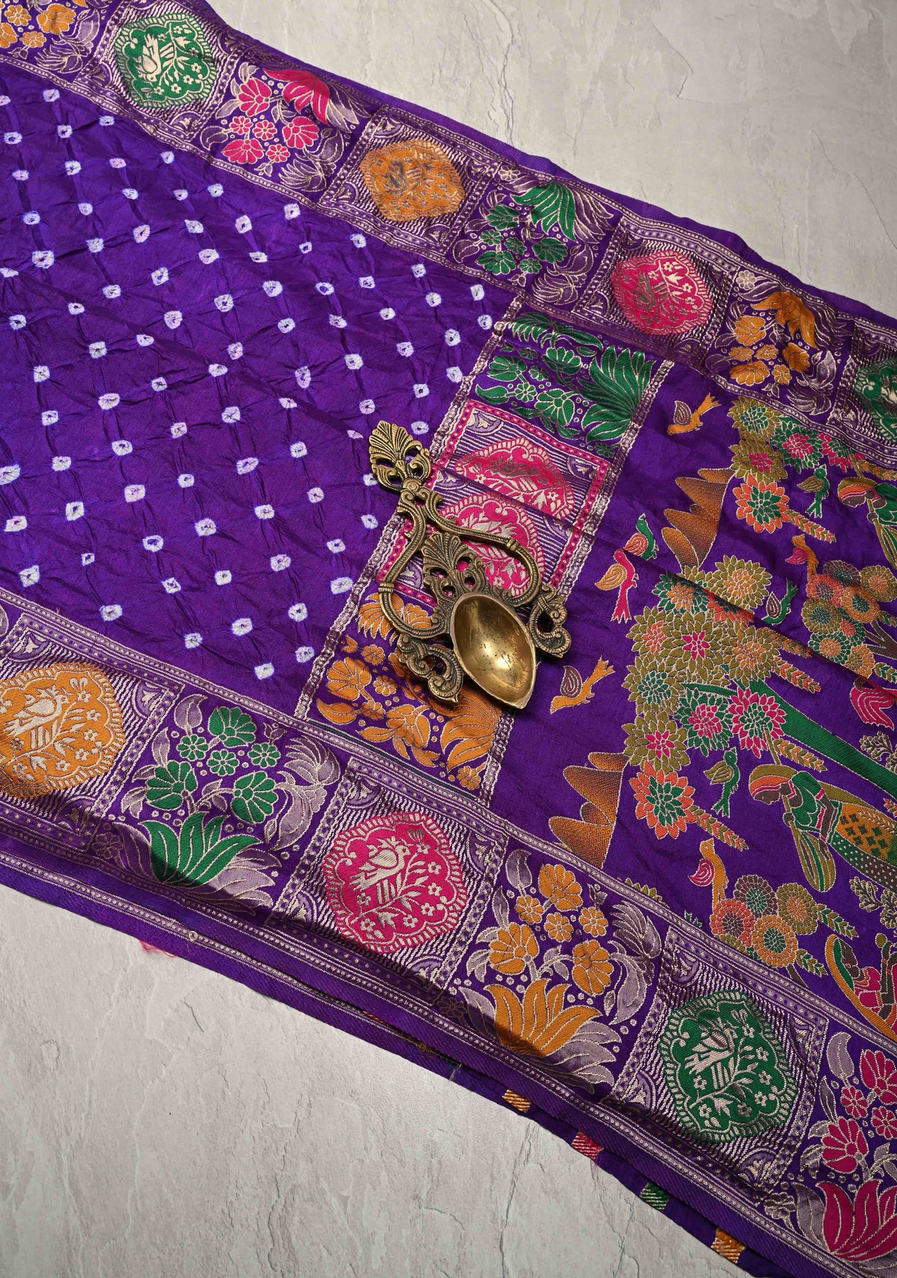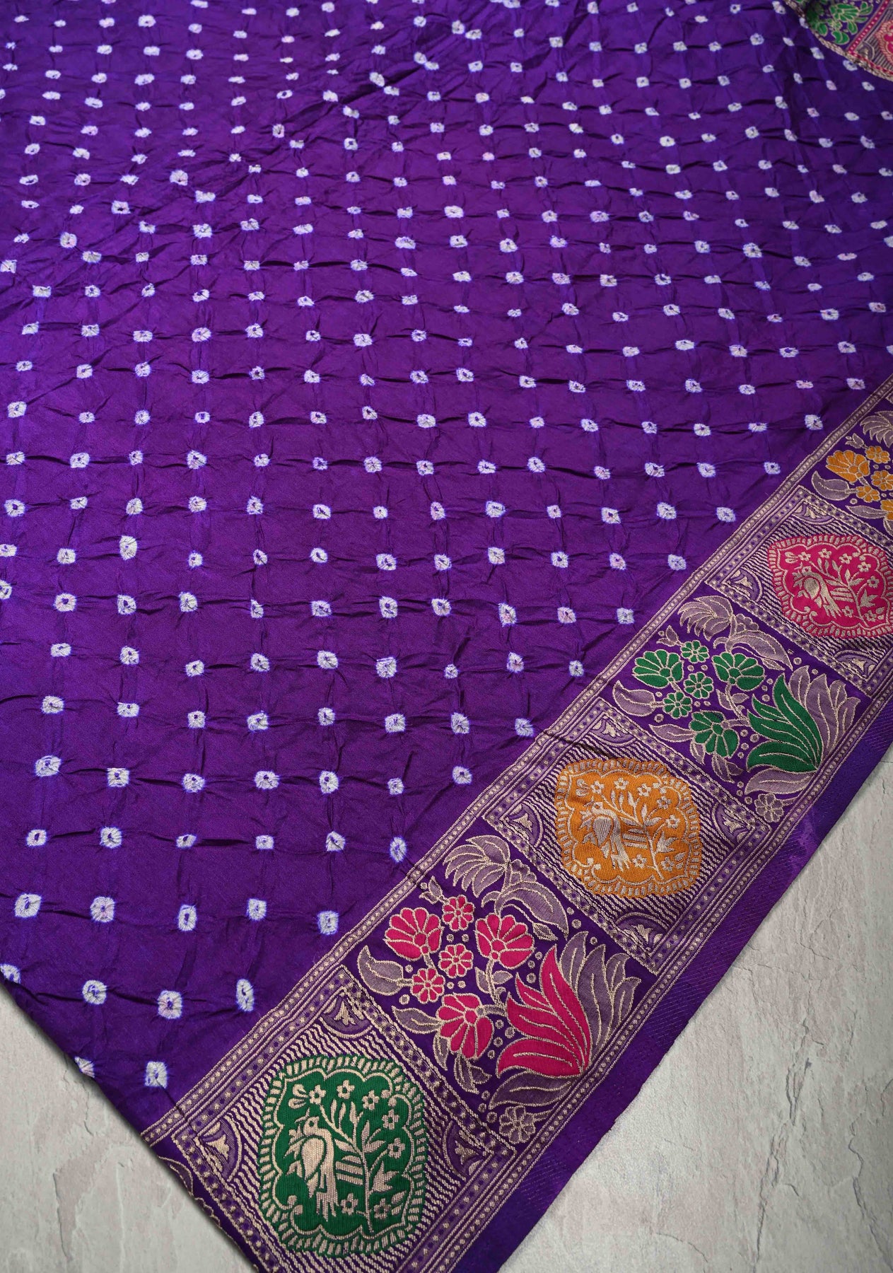 Immerse yourself in the allure of tradition with this exquisite Eggplant Purple Crushed Bandhani Saree, woven on smooth and lustrous art silk that drapes gracefully. The deep, rich eggplant purple shade exudes sophistication and charm, enhanced by the classic Bandhani tie-dye technique finished with a subtle crushed texture for added elegance and depth.