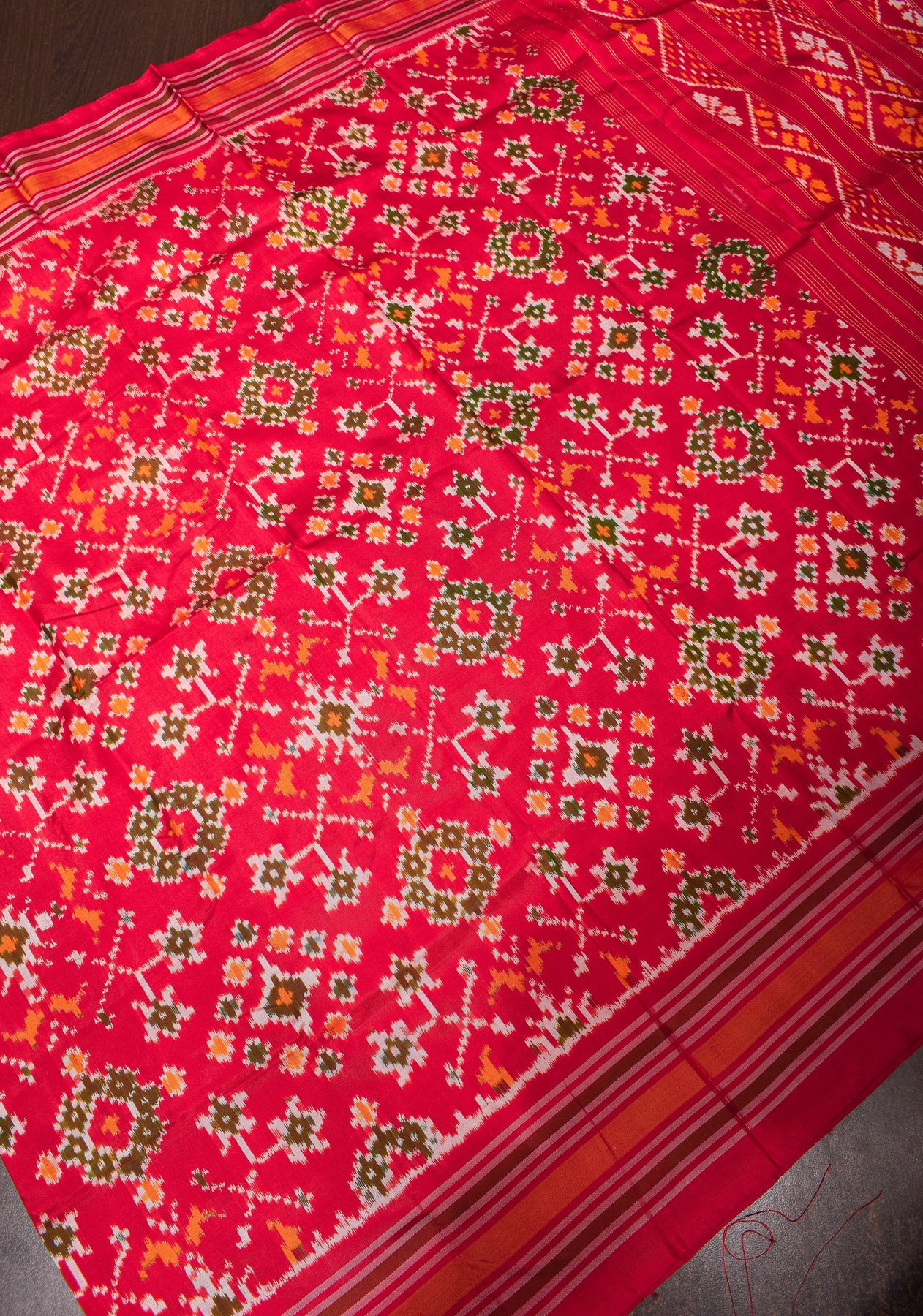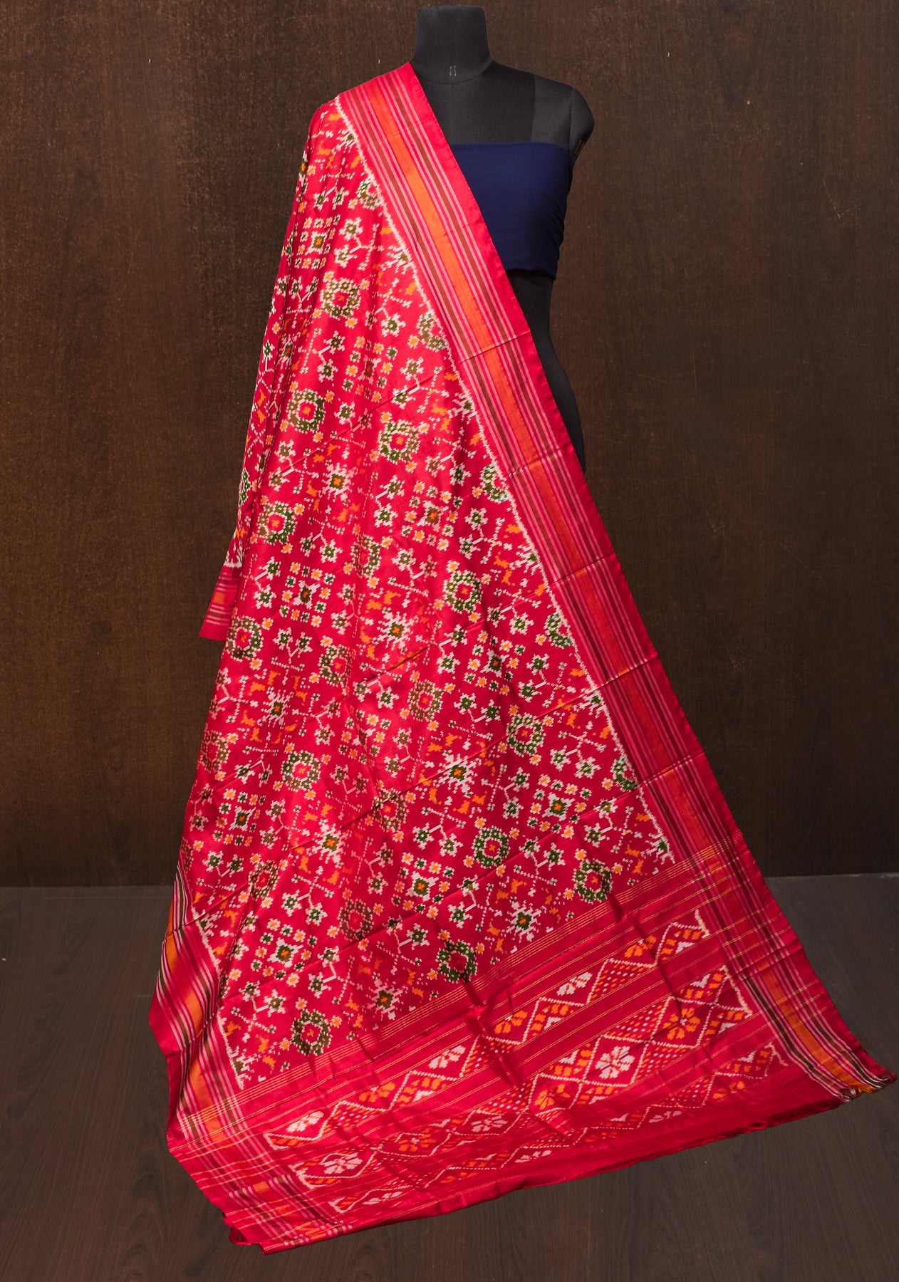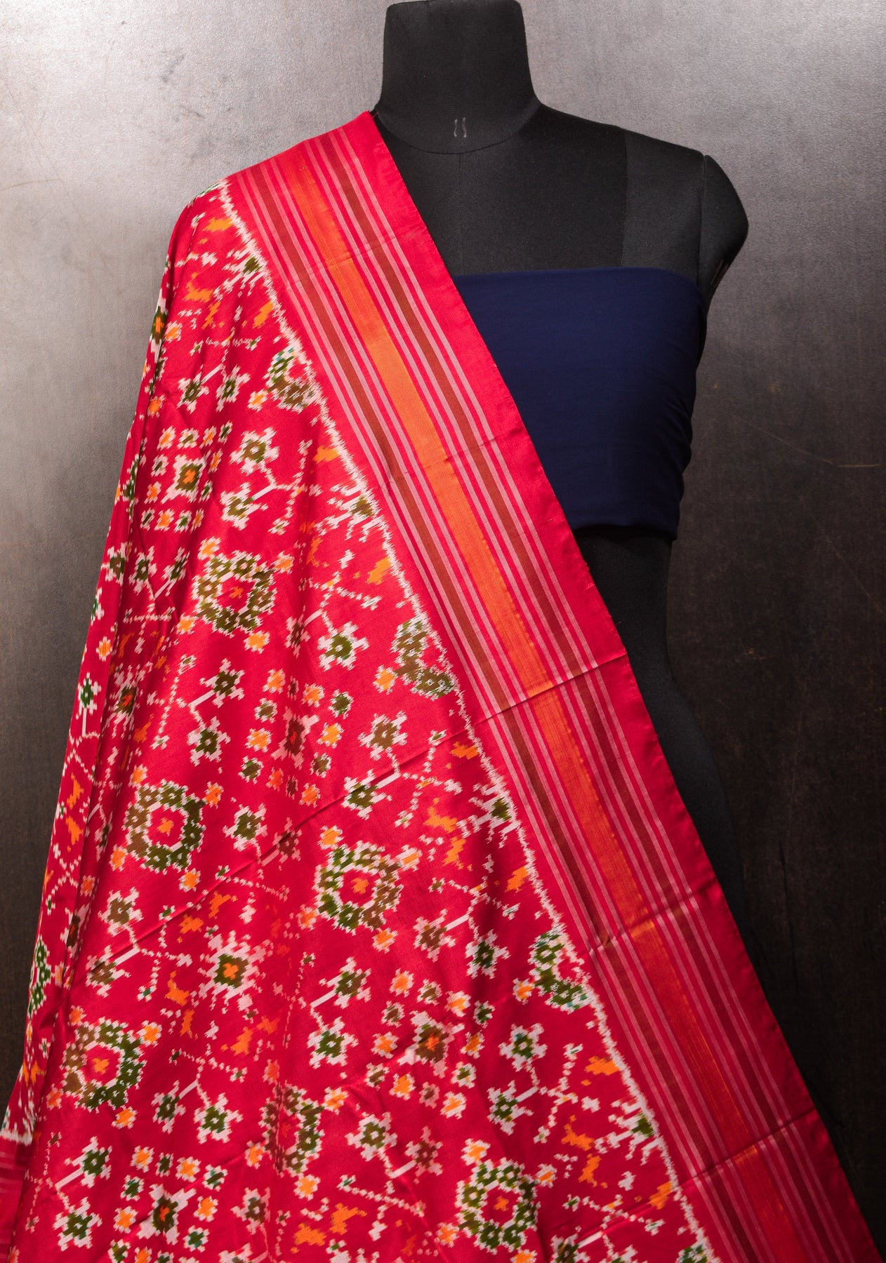 Brighten your wardrobe with this stunning Red Ikkat Patola Design Pure Silk Dupatta. Featuring intricate Ikkat patterns in a red hue, this luxurious piece adds a bold touch to any outfit. Made from pure silk, it drapes beautifully and is adorned with handmade tassels, enhancing its artisanal appeal. Perfect for festive occasions or to elevate your everyday look, this dupatta seamlessly blends traditional craftsmanship with contemporary elegance.
