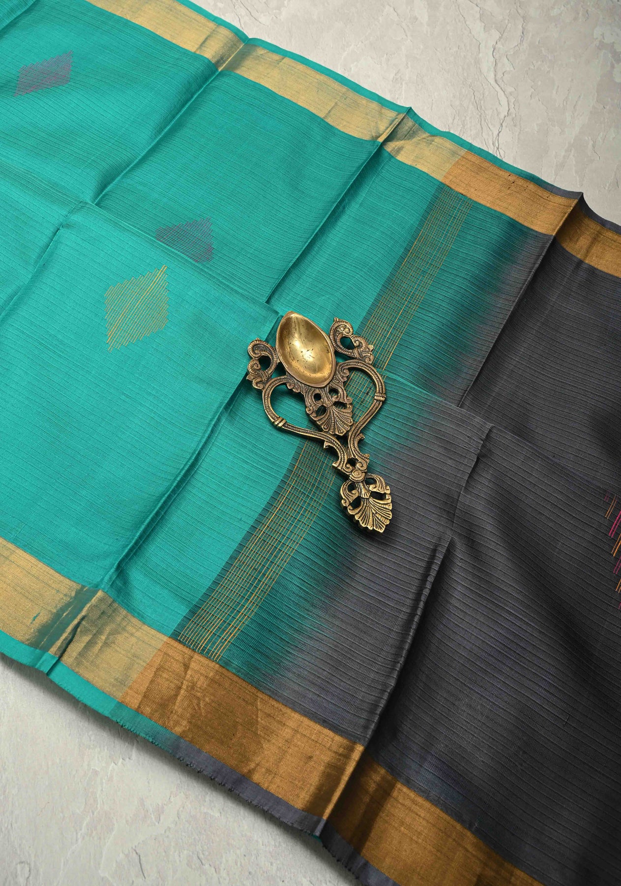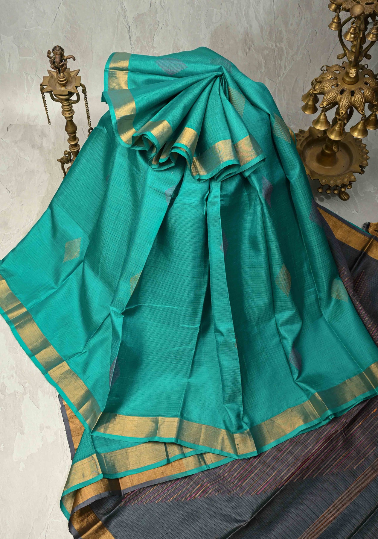 Radiate understated luxury with our Sea Green Handloom Pure Silk Saree. Expertly handwoven, this drape features delicate Meenakari thread buttas that add a vibrant, jewel-like pop of color to the refreshing sea green base. The elegant Zari border lends a classic touch of shimmer, making it a sophisticated choice for weddings and formal celebrations. Experience the superior drape of authentic handloom silk—a timeless masterpiece designed for those who cherish traditional craftsmanship.