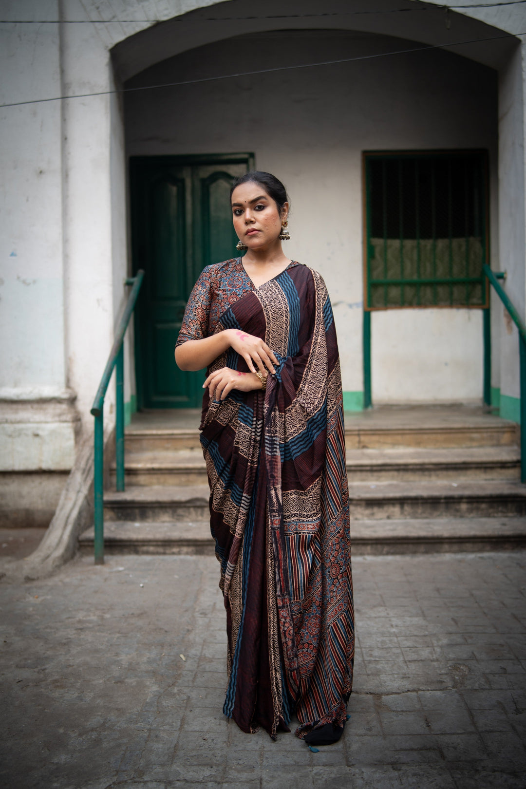 Black Hand Block Print on Modal Silk Saree with Ajrakh Pallu
