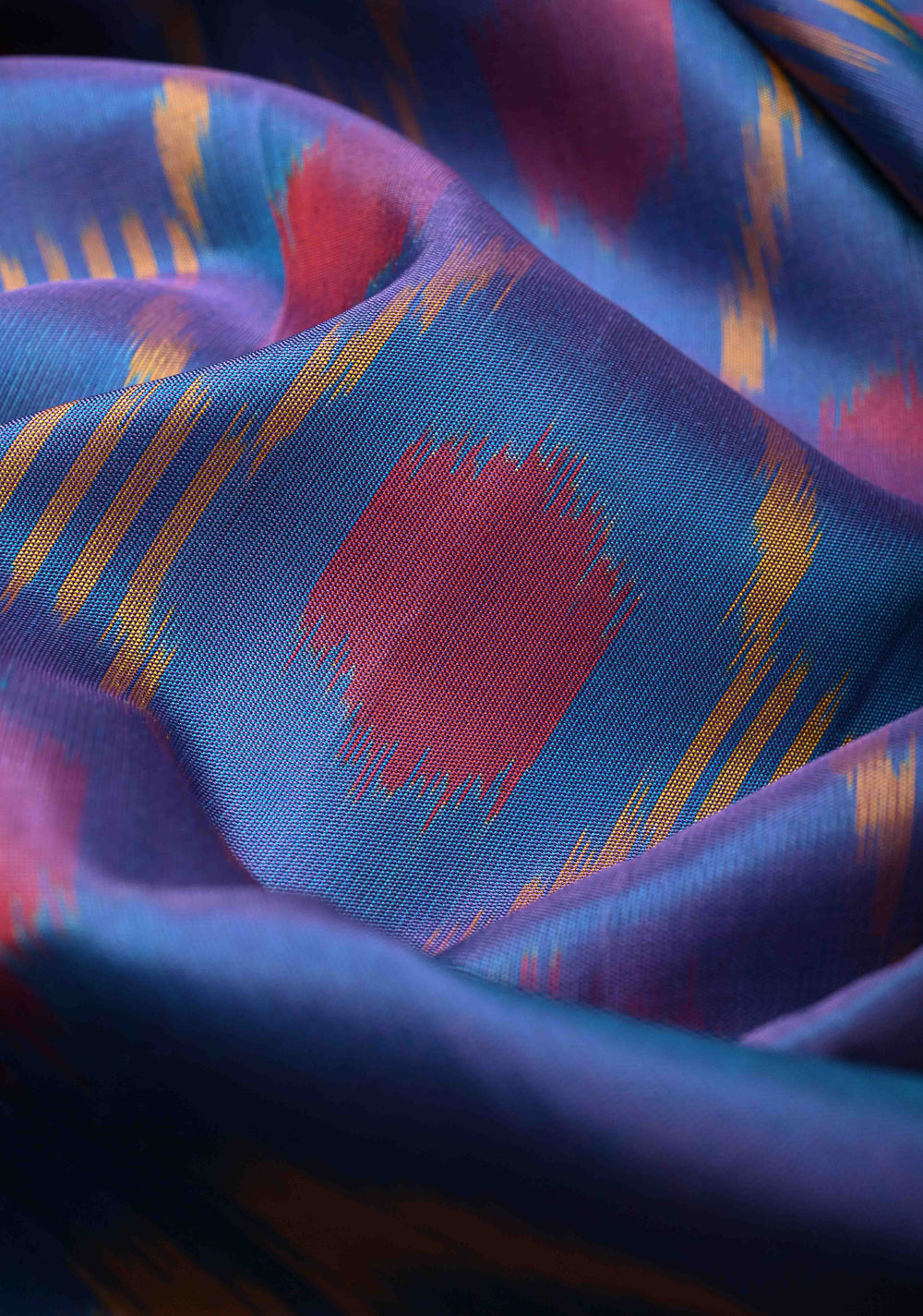 Periwinkle fusion Ikkat Kanjivaram Soft Silk Saree with Geometric and Contrast Zari Border | SILK MARK CERTIFIED