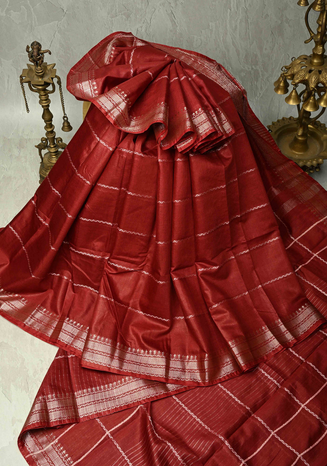 Scarlet Red Semi Tussar Saree with Thread Stripes and Temple Zari Border