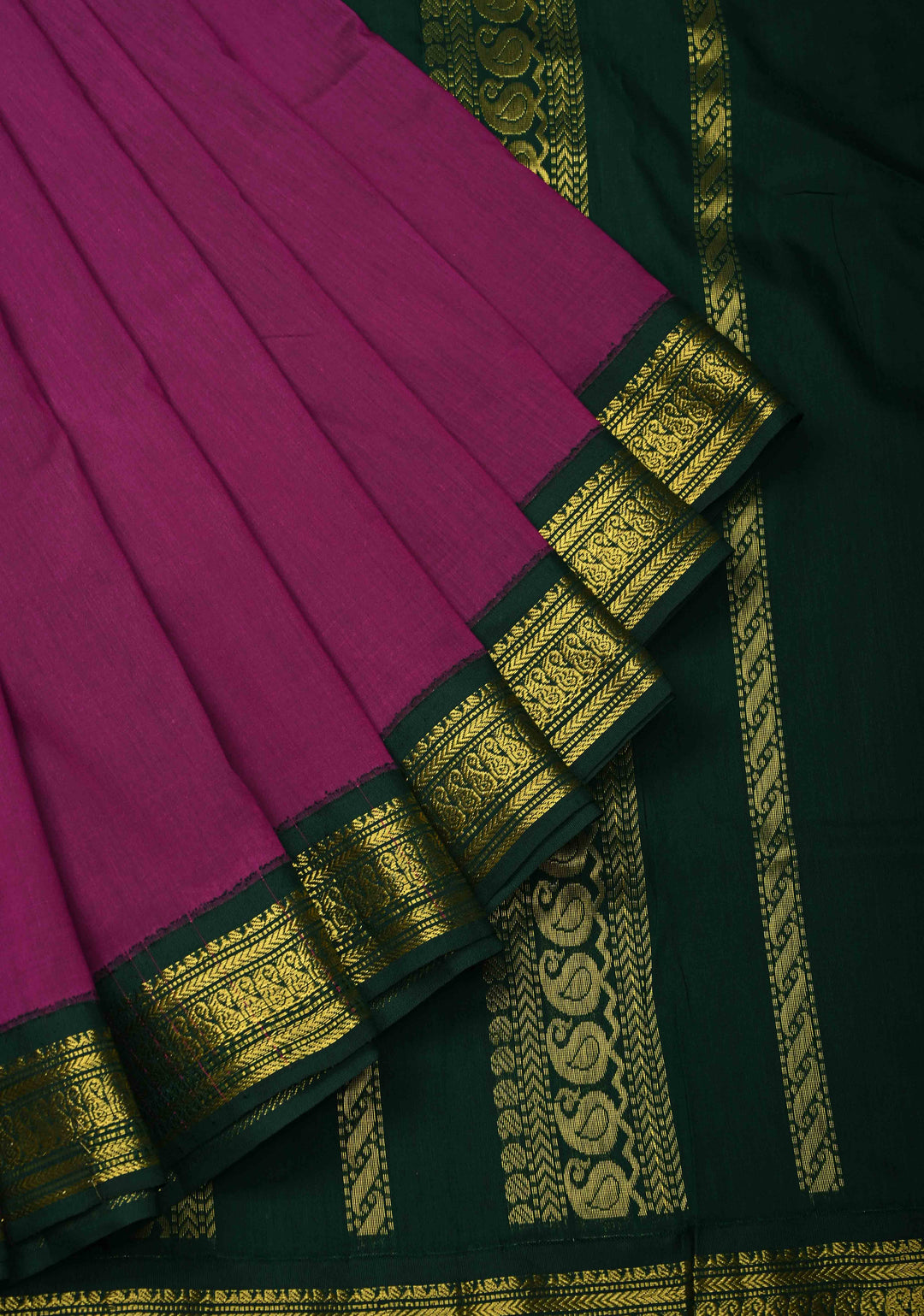9 Yards Purple Cotton Silk Saree with Contrast Green Zari Borders, No Blouse Piece