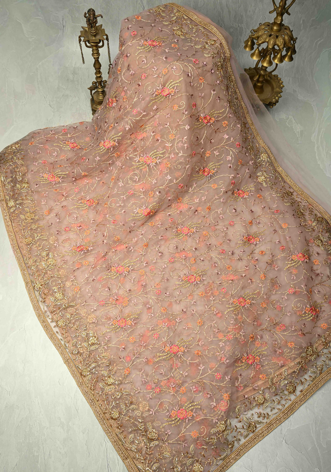 Dusty Rose Floral Embroidery Jaal on Net Saree with Stone, Zari Thread Handwork and Lace Border