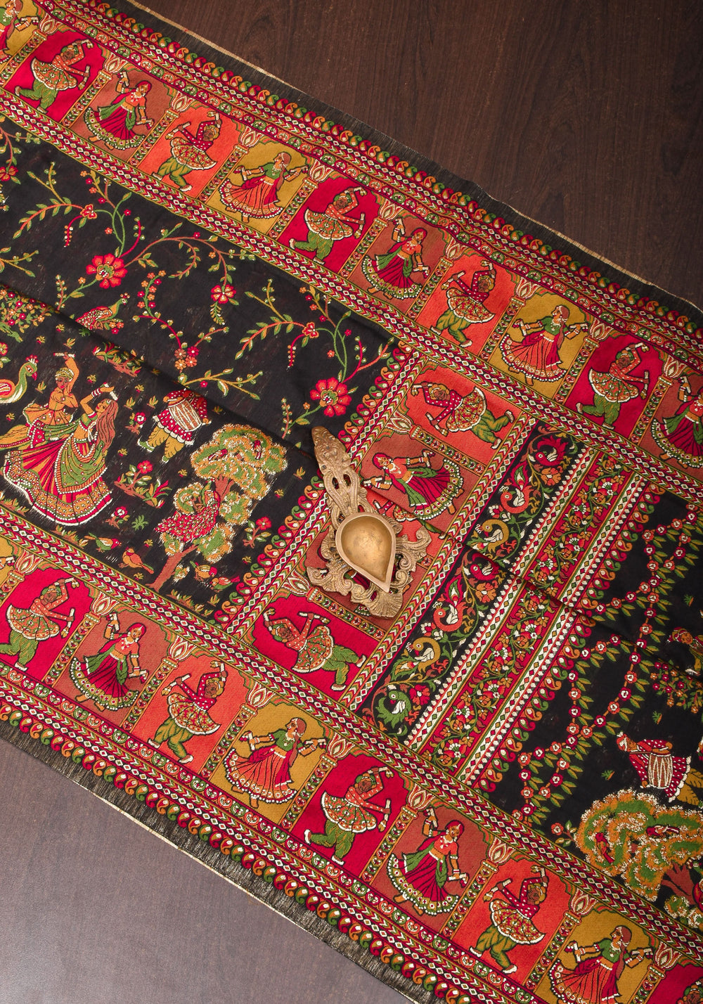 Rayon Saree in Kani Design and Floral Jaal in Black with Dandiya Dancers on pallu and Borders