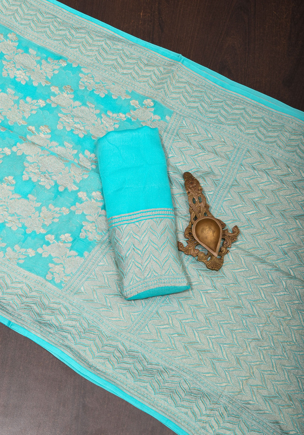 Cyan Pure Georgette Silk Banarasi Saree with Rose Jaal Weave in Silver Tone Zari | SILK MARK CERTIFIED