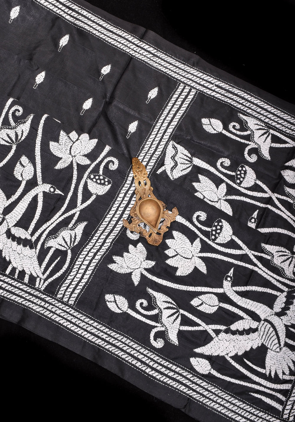 Kantha Embroidery Saree in Black with White Lotus in Art Silk