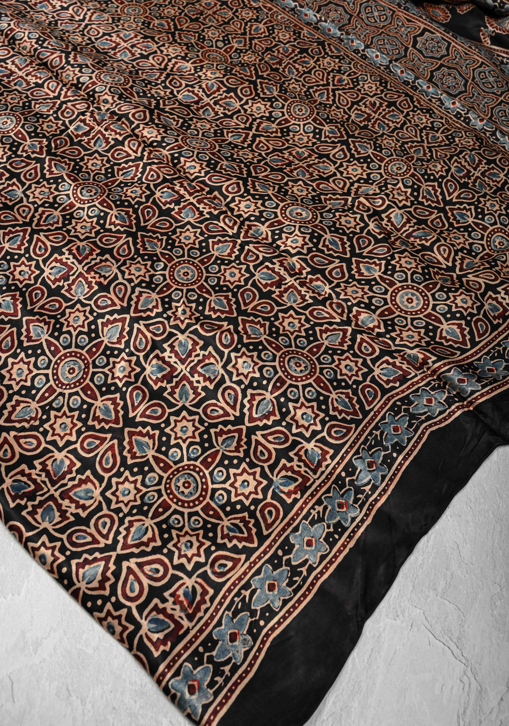 Black Modal Silk Stole with Ajrakh Lotus Handblock Print and Tassels