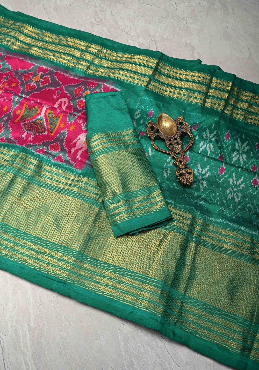 Sap Green Pochampally Ikkat Pure Silk Saree Patola Brocade and Contrast Zari Border | SILK MARK CERTIFIED
