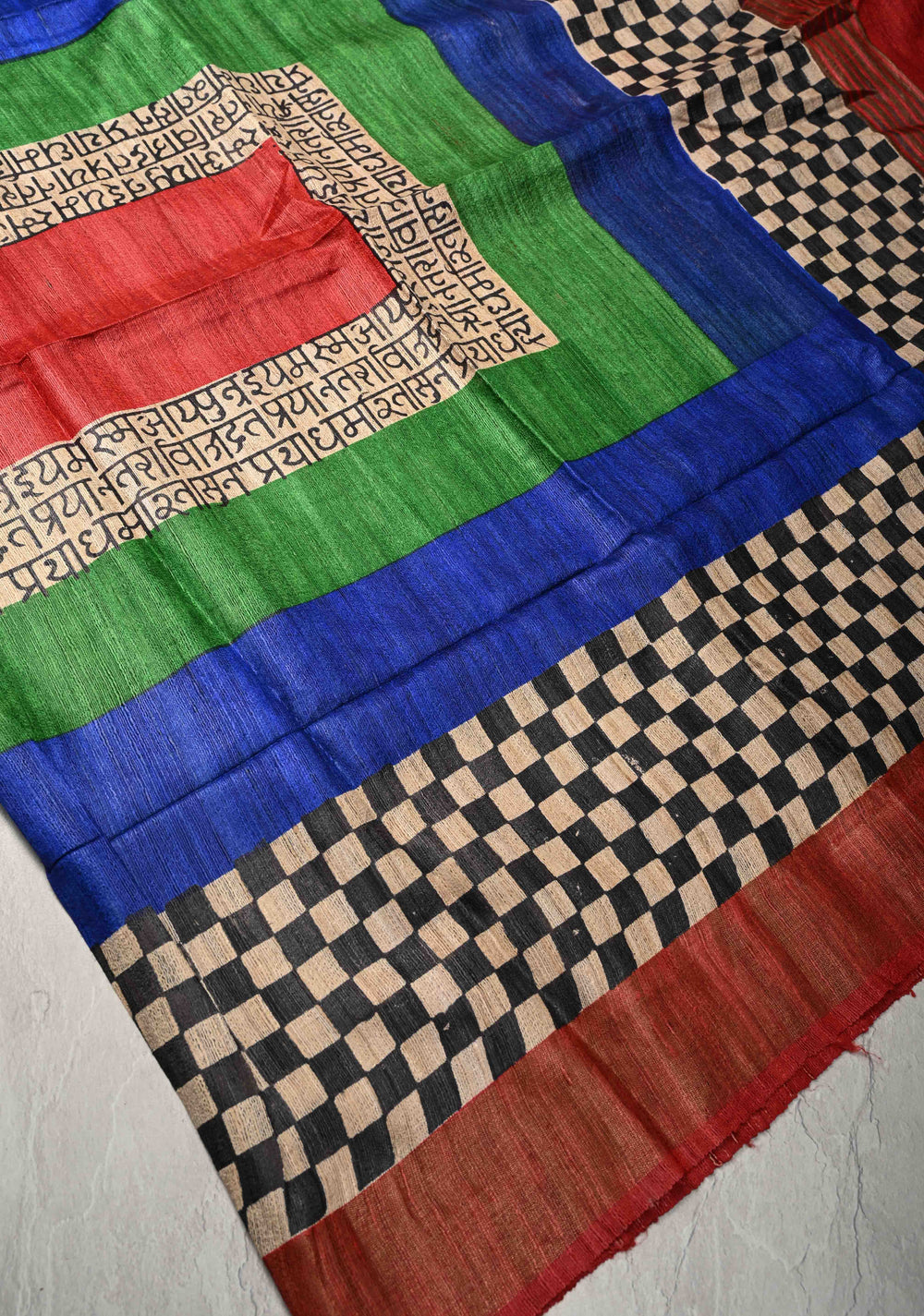 Multicolor Authentic Hand Block Print on Geecha Tussar silk saree with Zari Border | SILK MARK CERTIFIED
