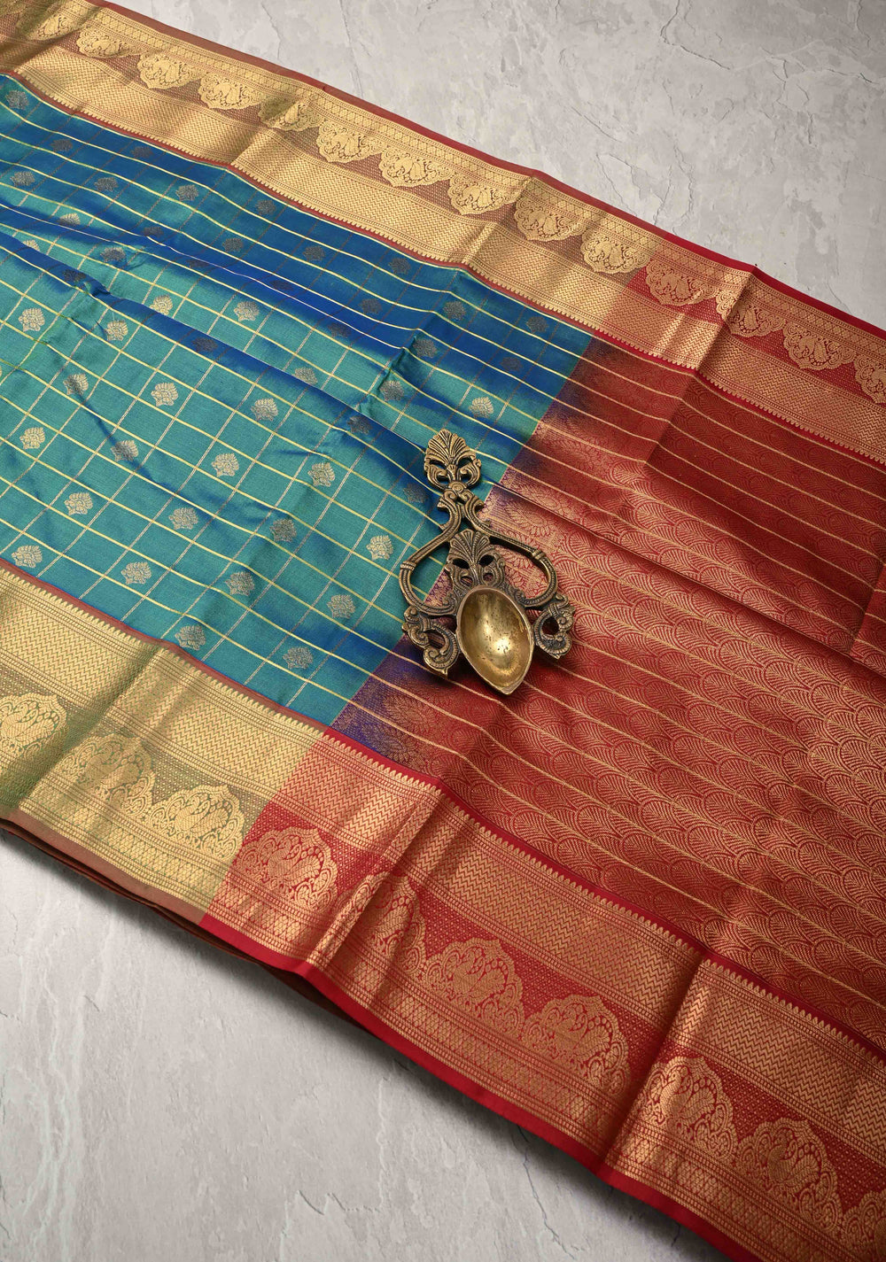 Blue Dual tone Zari Checks on Kanjivaram Soft Silk Saree with Zari Buttas and Contrast Zari Border | SILK MARK CERTIFIED
