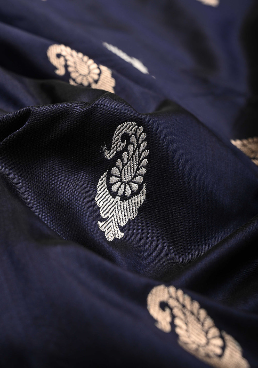 Midnight Blue Banarasi Katan Silk Saree with Sona Rupa Buttas and Meenakari Scallop Border | SILK MARK CERTIFIED