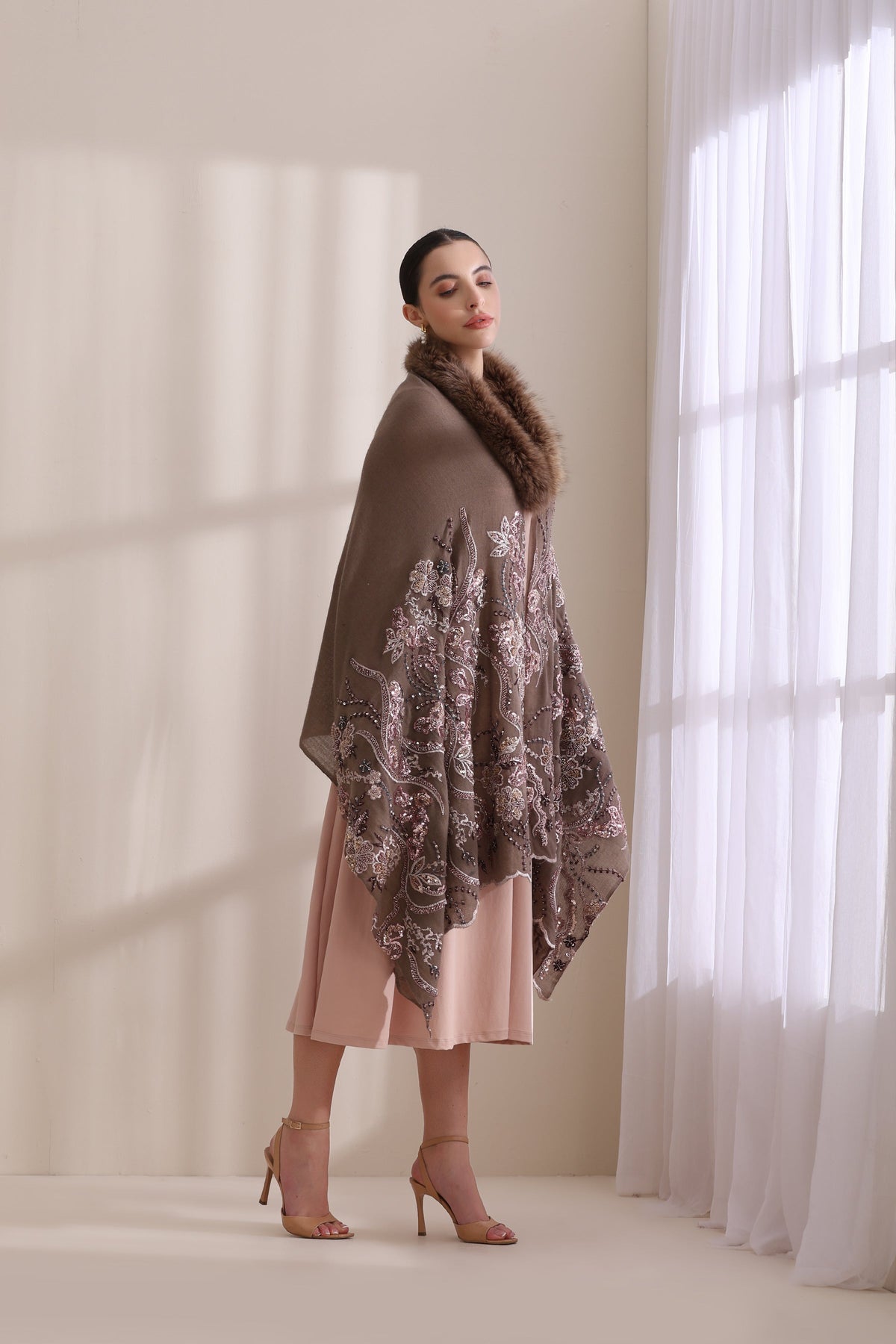 Elevate your style with this luxurious brown stole, featuring a plush faux fur collar and intricate floral embroidery with shimmering beadwork. Perfect for evening events or special occasions, this stole adds elegance, warmth, and a sophisticated touch to any outfit.