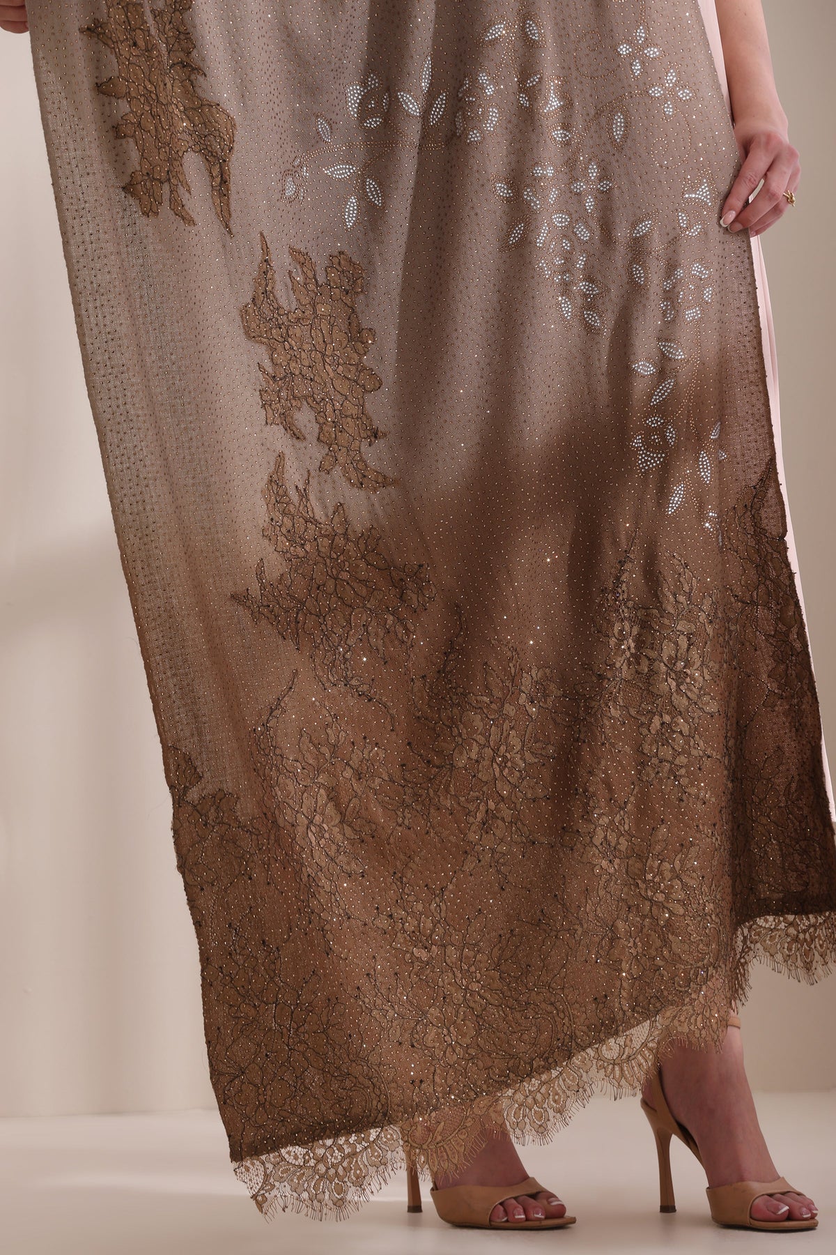 This elegant dusky brown stole features delicate silver floral motifs and rich lace embroidery, offering a luxurious look perfect for gifting. Crafted from soft, fabric, it drapes gracefully and complements any outfit. Ideal for festive occasions, its detailed design adds charm and sophistication to every celebration, making it an unforgettable present.