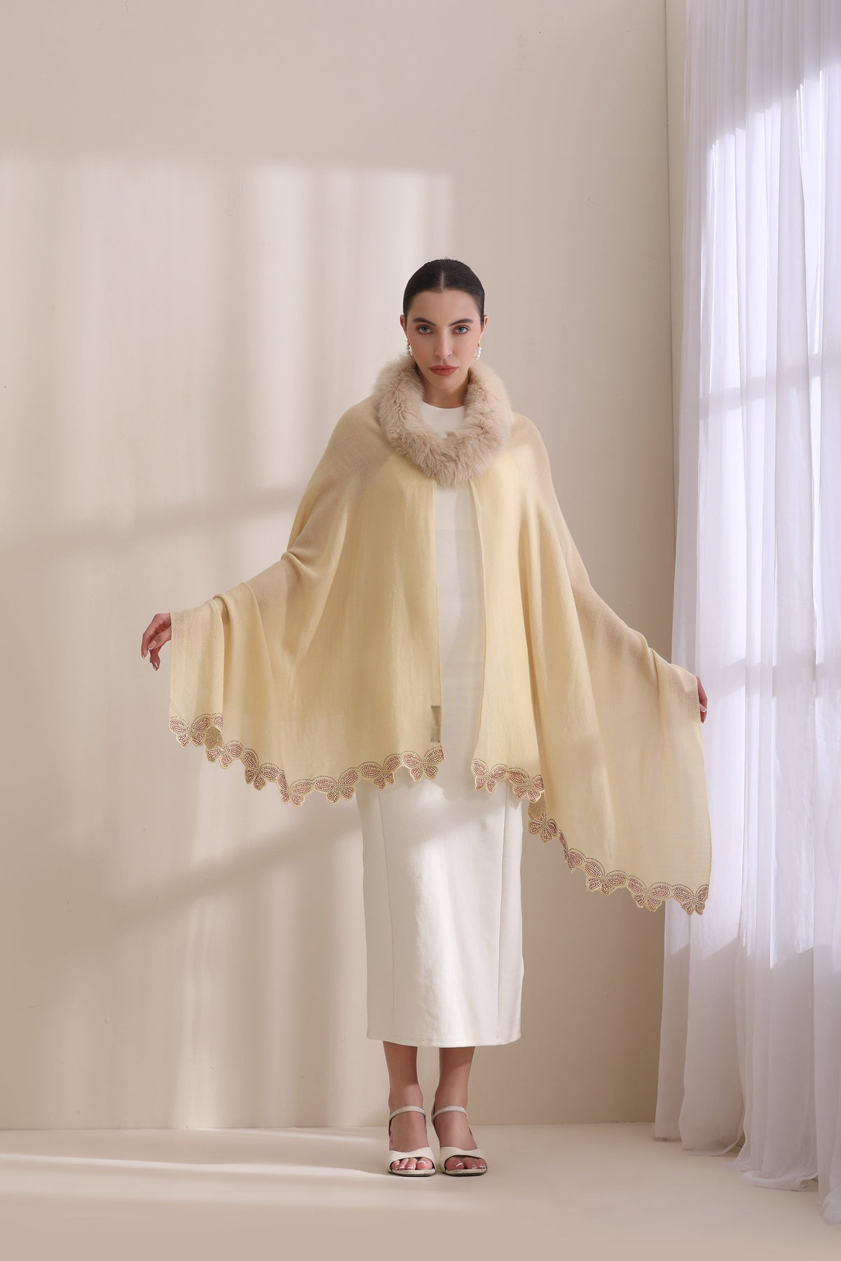 Luxurious cashmere fine wool stole in a soft cream hue, adorned with a plush faux fur collar for an elegant winter look. The hemline features intricate butterfly scallop motifs, delicately detailed with stones and sequins, adding a subtle sparkle and refined touch for special occasions and evening wear.