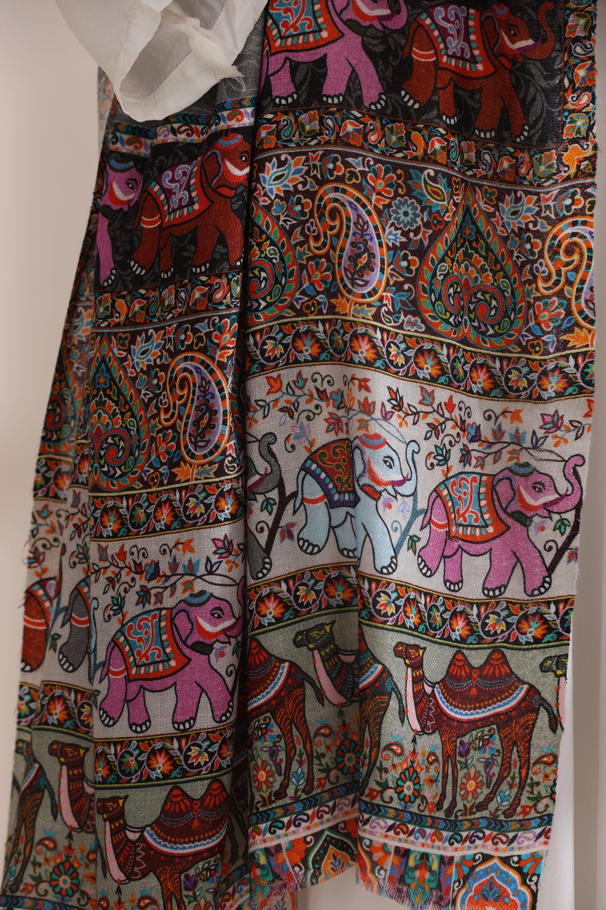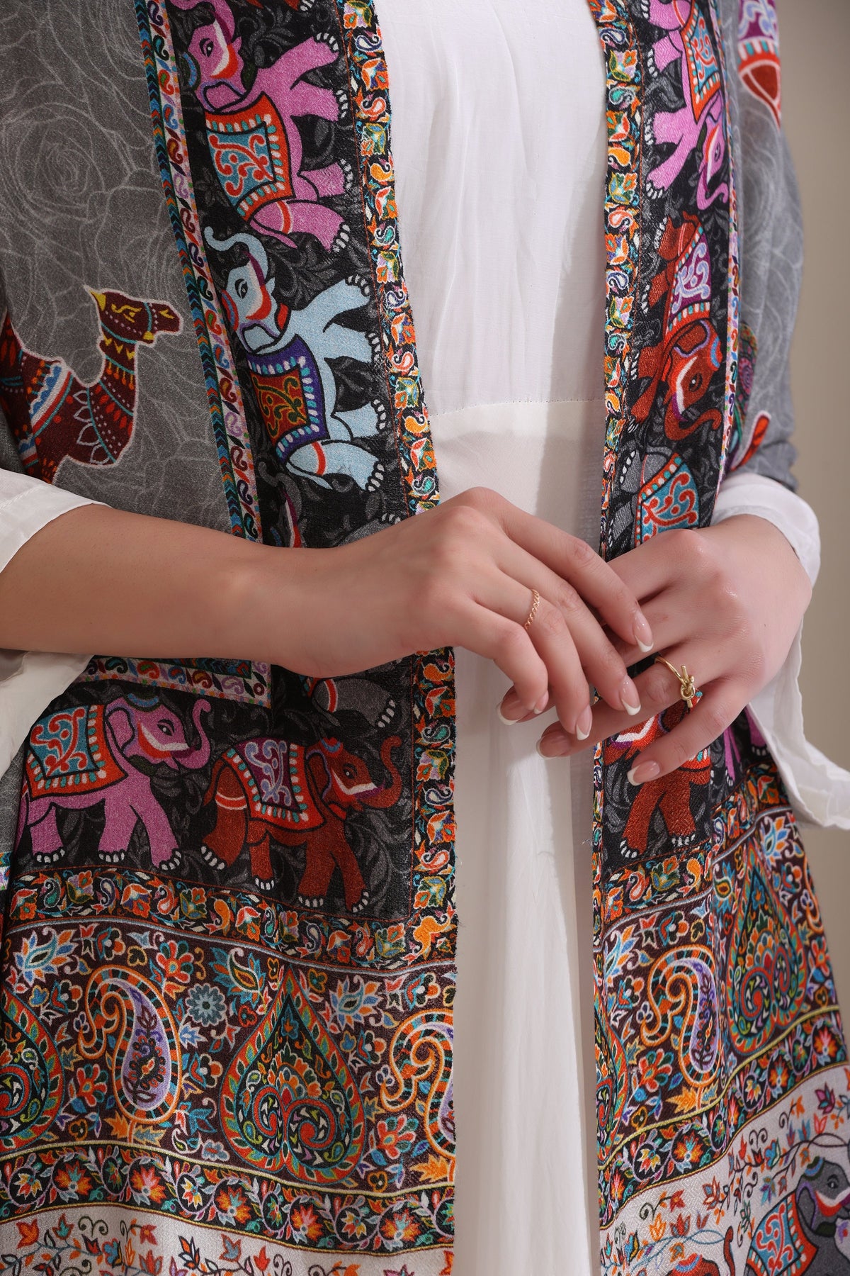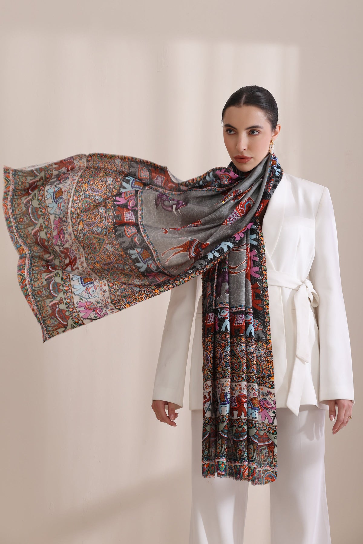 Elegant multicolored printed stole in regal grey, adorned with vibrant elephant and camel motifs and intricate borders, perfect for gifting. Crafted from extra-soft fabric, its richly detailed work celebrates Indian artistry for a classy, standout look. A luxurious accessory that adds traditional charm to any modern wardrobe