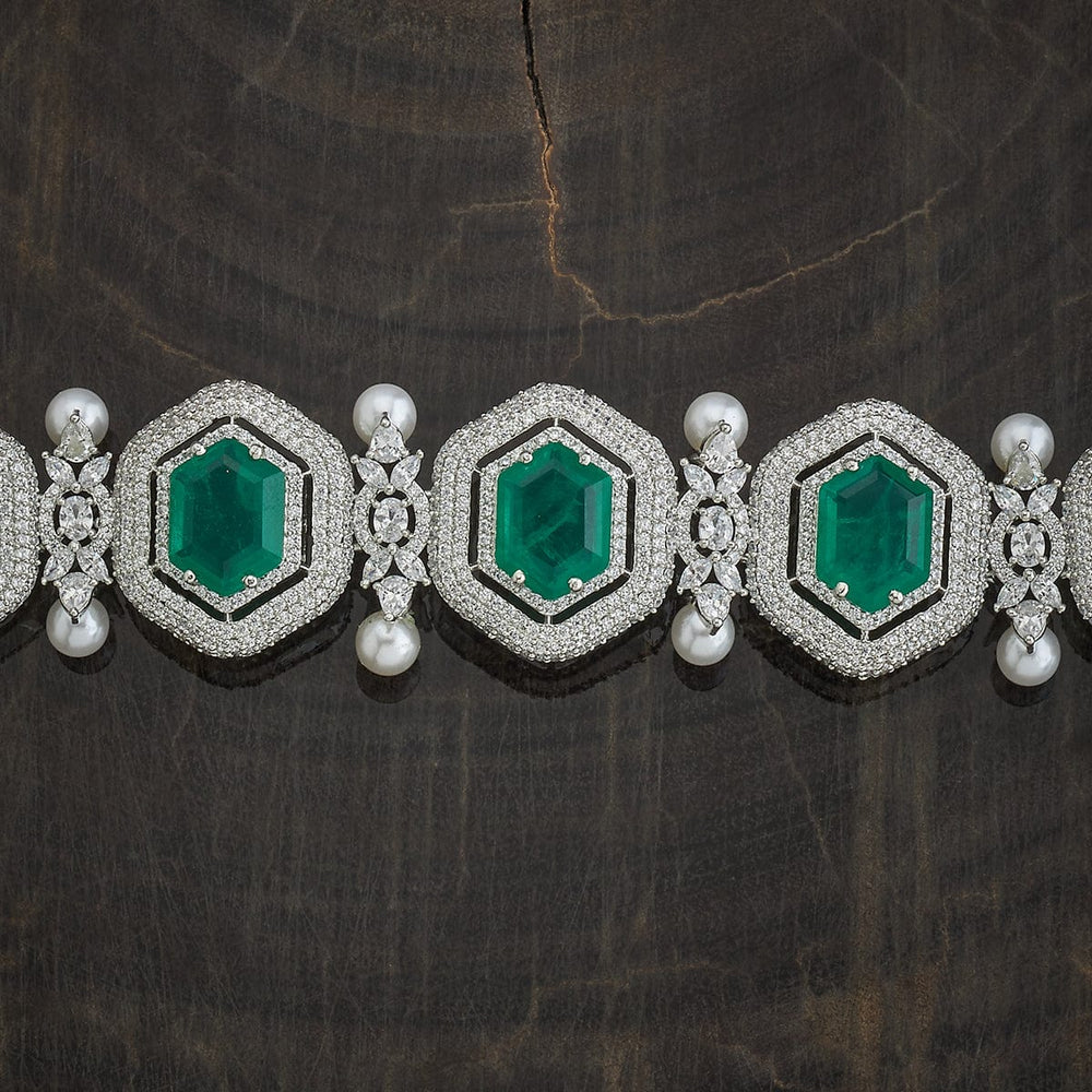 The Emerald and Zircon Necklace Set with CZ Details is a stunning fusion of classic elegance and modern sparkle. Featuring green emerald stones set alongside shimmering white zircons, this set exudes refined luxury. Intricately crafted with CZ (cubic zirconia) accents, the necklace catches the light beautifully, making it perfect for evening occasions, weddings, or festive celebrations. Complete with matching earrings, this set adds a sophisticated touch to any traditional or contemporary outfit.