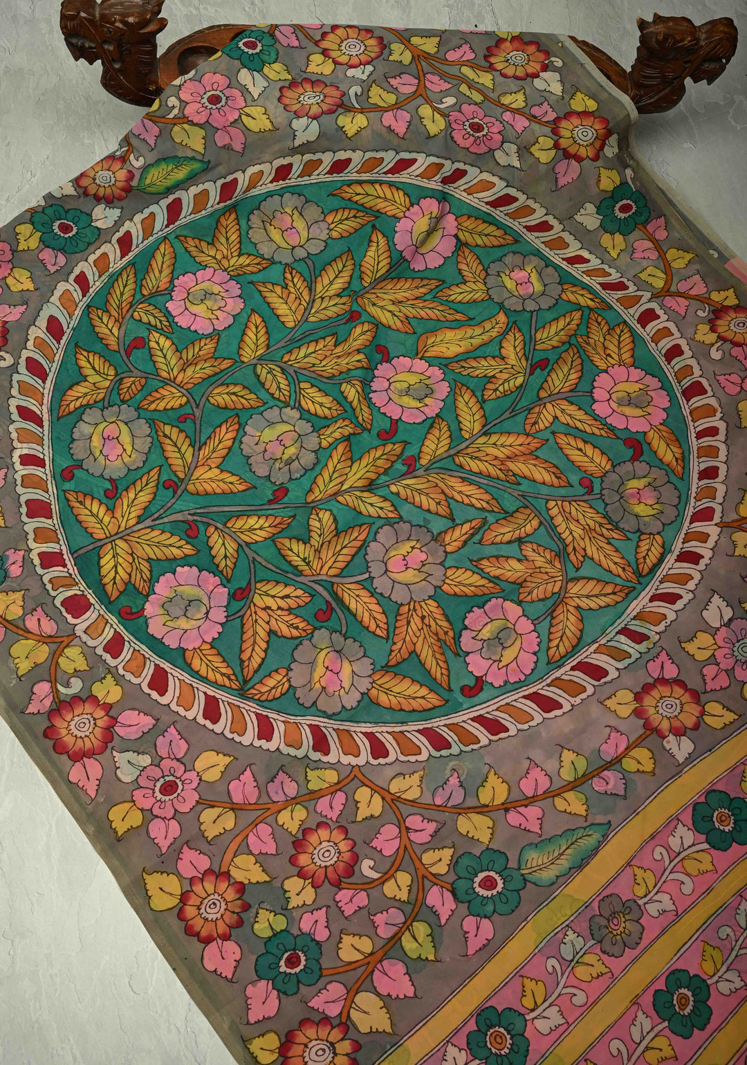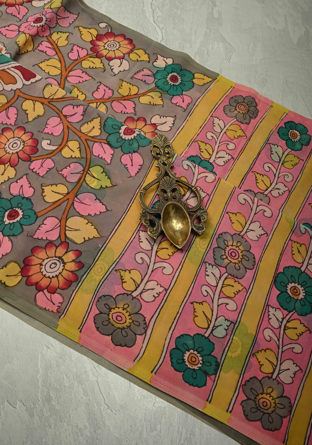 Floral theme - Authentic Pen Kalamkari on Pure Georgette Silk Saree in Multicolor | SILK MARK CERTIFIED