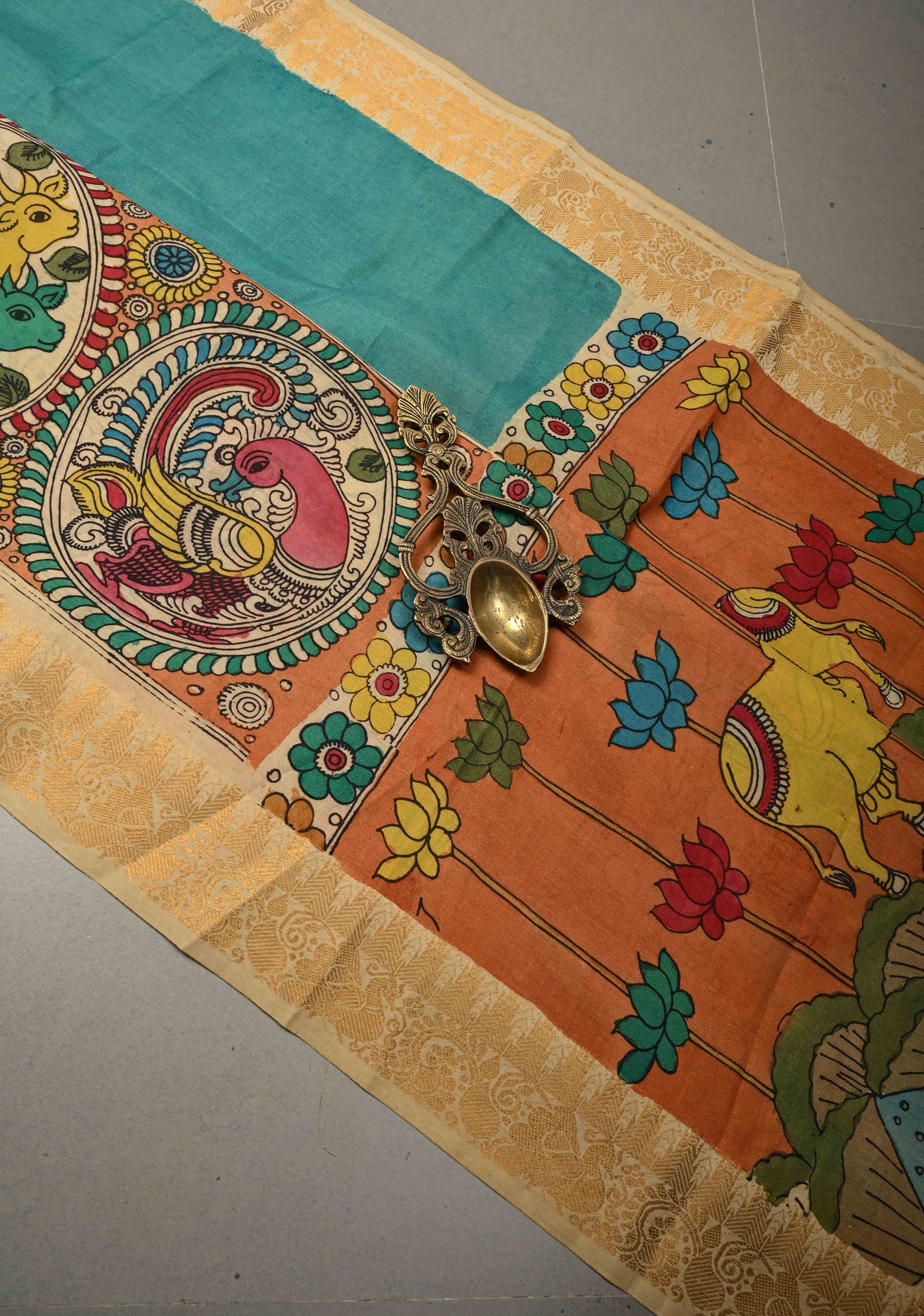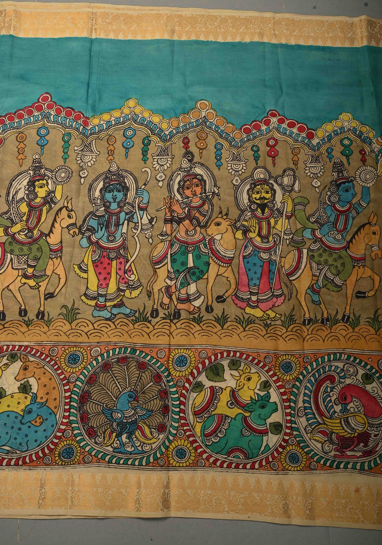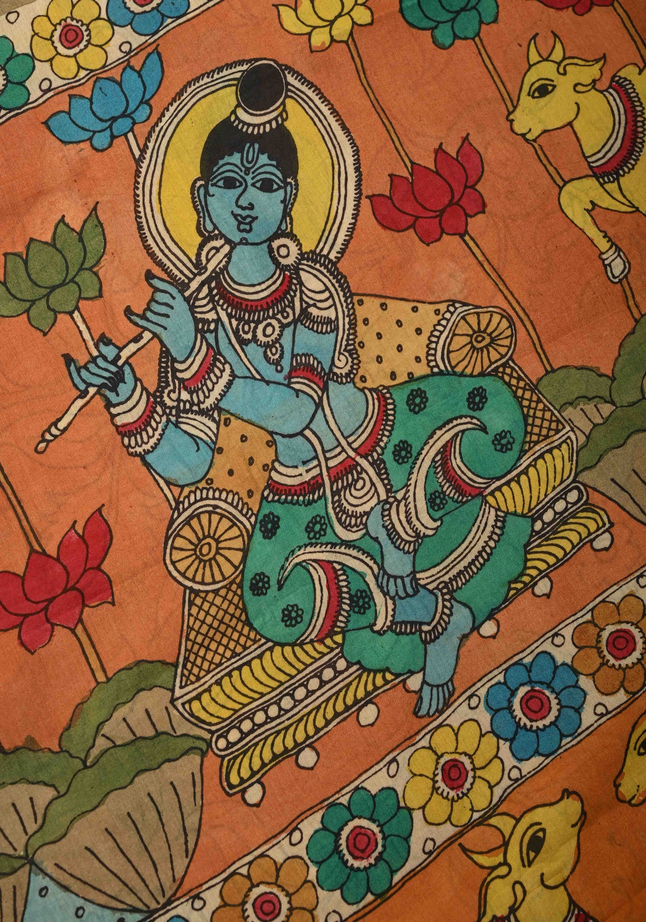 Embrace divine storytelling with this exquisite Bangalore Silk Saree, featuring an authentic hand-painted Pen Kalamkari narrative. The vibrant teal and rust-orange canvas serves as a sacred backdrop for the Krishna Leela and Dashavatara themes, meticulously illustrating the life of Lord Krishna and the ten incarnations of Vishnu. Framed by a traditional gold zari border, this heritage piece blends artisanal craftsmanship with regal elegance, making it a masterpiece for festive occasions.