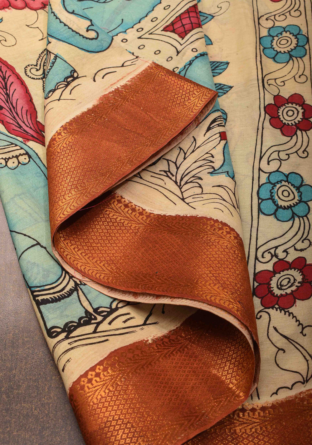 Elephant Theme : Beige Authentic Pen kalamkari on Mangalagiri Silk Saree with zari border