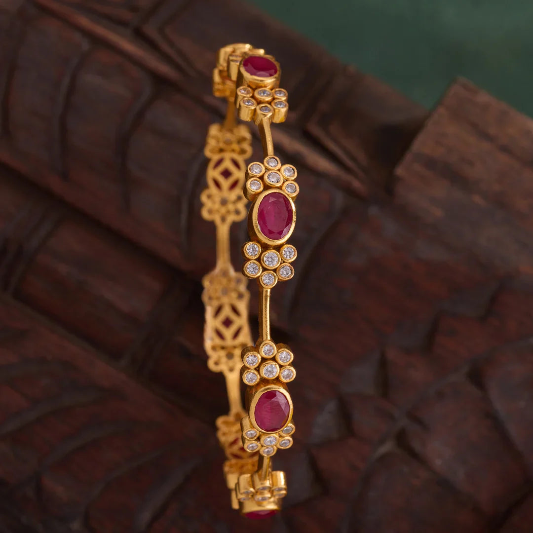The Phool of Oval Bangles showcases an expert design featuring Oval-shaped Rubies arranged in an elegant Floral pattern, accentuated by sparkling Cubic Zirconia stones. This combination enhances both the richness of the Rubies and the intricate detailing of the Floral motif, offering a refined accessory that adds a sophisticated charm to any ensemble.