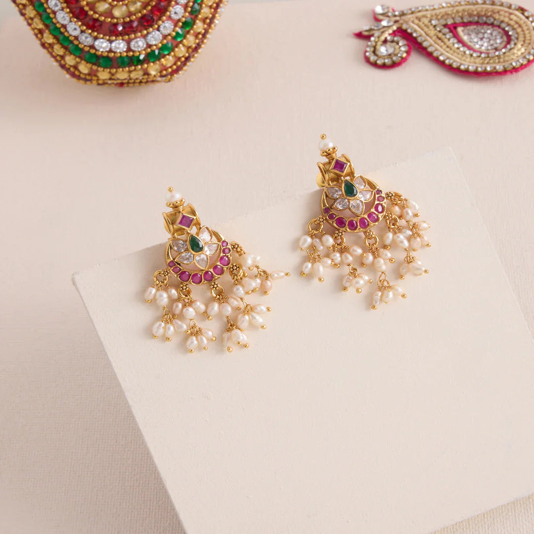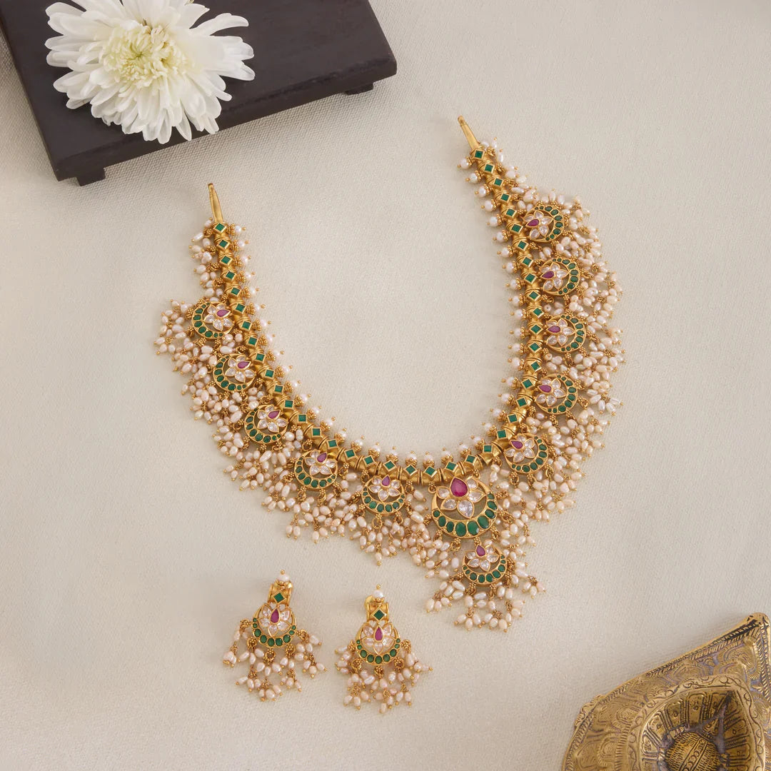 Mahira Guttapusalu Necklace Set showcases intricate Floral motifs expertly crafted with sparkling Kundan stones and lustrous Pearls. This elegant design combines traditional artistry with refined sophistication, making it an ideal accessory to elevate formal and festive attire. Carefully detailed, the necklace and earrings offers a timeless appeal that complements a variety of styles.