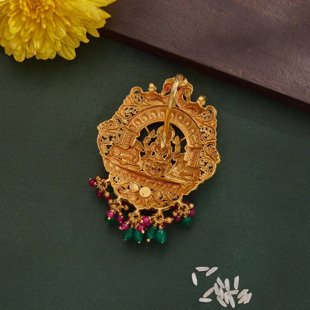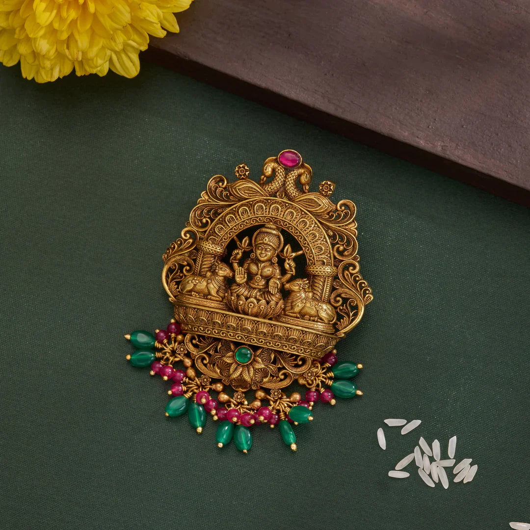 The Nandini Padma Pendant exquisitely combines traditional symbolism with refined craftsmanship. Featuring a detailed depiction of Lakshmi alongside Nandini, this pendant is adorned with intricate Floral and Peacock motifs. Emerald and Ruby hangings enhance its elegance, adding vibrant colour and richness. Perfect for those who appreciate heritage-inspired designs, this piece offers both beauty and cultural significance.