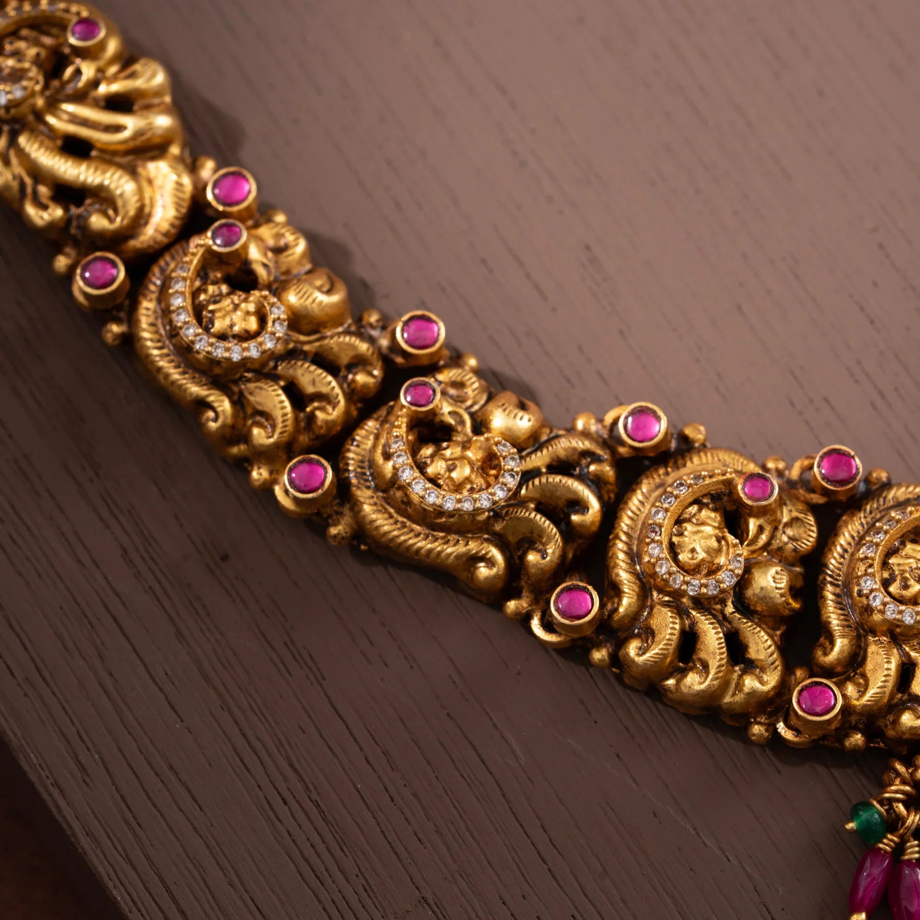 The Devi Hasti Mandala Short Necklace showcases exquisite craftsmanship with intricate Motifs of Lakshmi, Peacock, and Elephant, symbolizing prosperity, grace, and strength. Adorned with carefully set CZ stones, Emeralds, and Rubies, it radiates vibrant elegance. The Emerald and Ruby hangings add refined movement and colour contrast, making this necklace a distinguished statement piece that blends traditional symbolism with sophisticated design. Ideal for complementing formal and festive attire, it reflects both artistry and cultural richness.