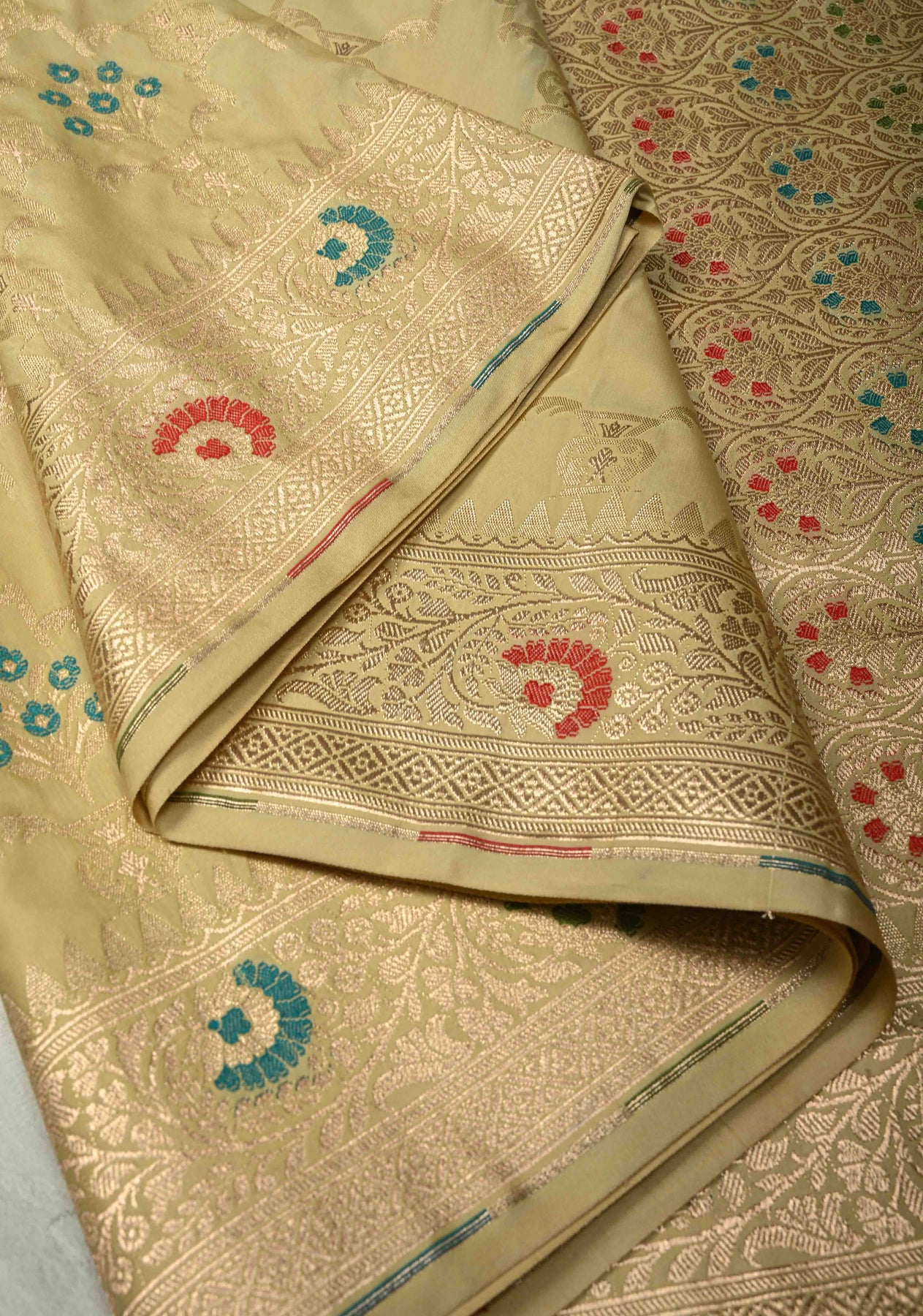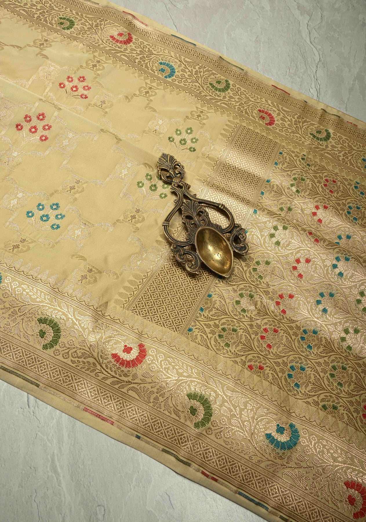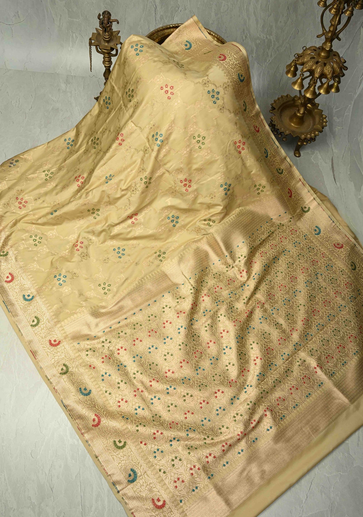 The serene cream hue paired with intricate Meenakari work creates a subtle yet regal appeal—perfect for brides, wedding guests, festive occasions, and traditional celebrations. Blending heritage Banarasi craftsmanship with understated sophistication, this saree is a masterpiece of artistry and elegance.