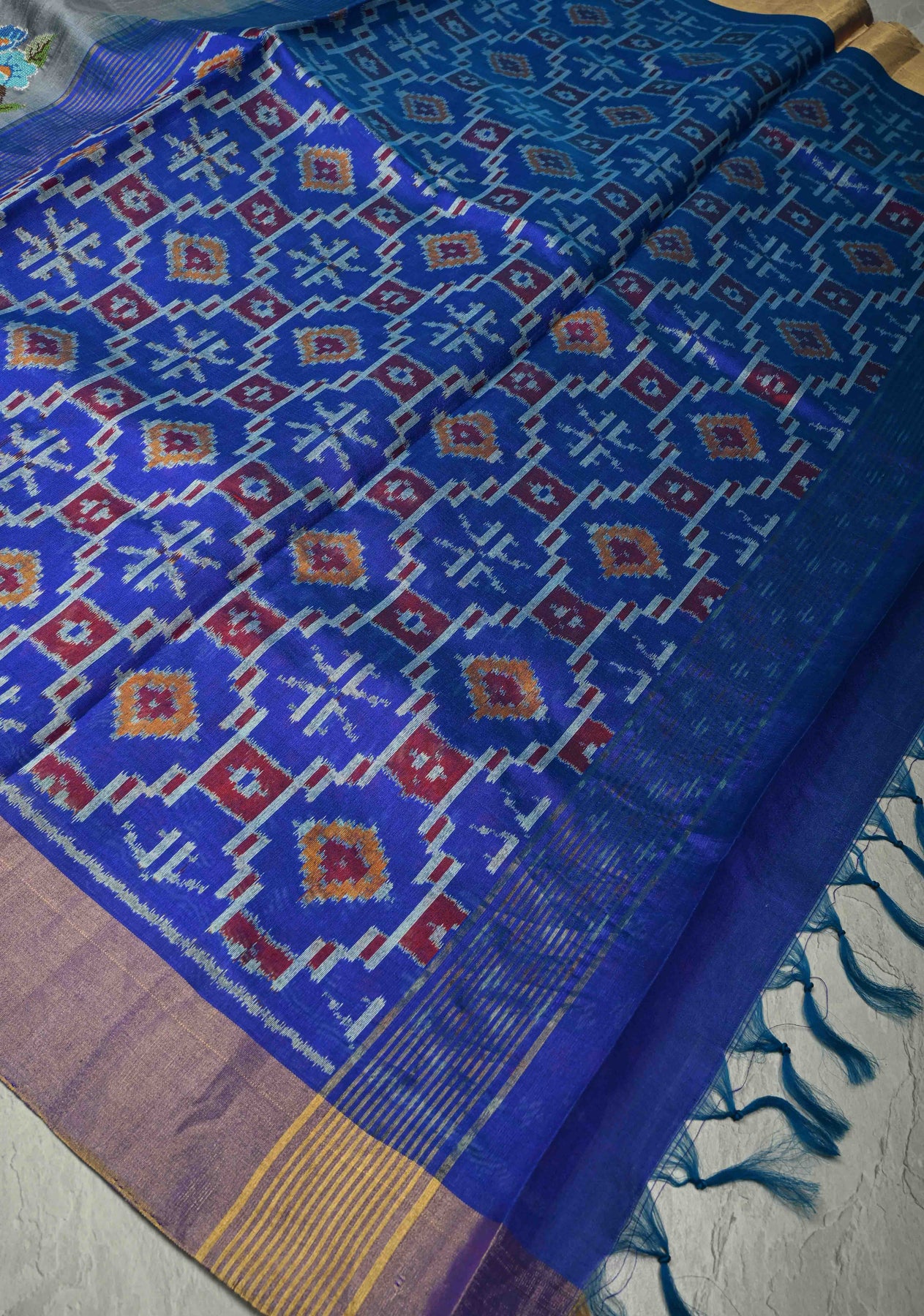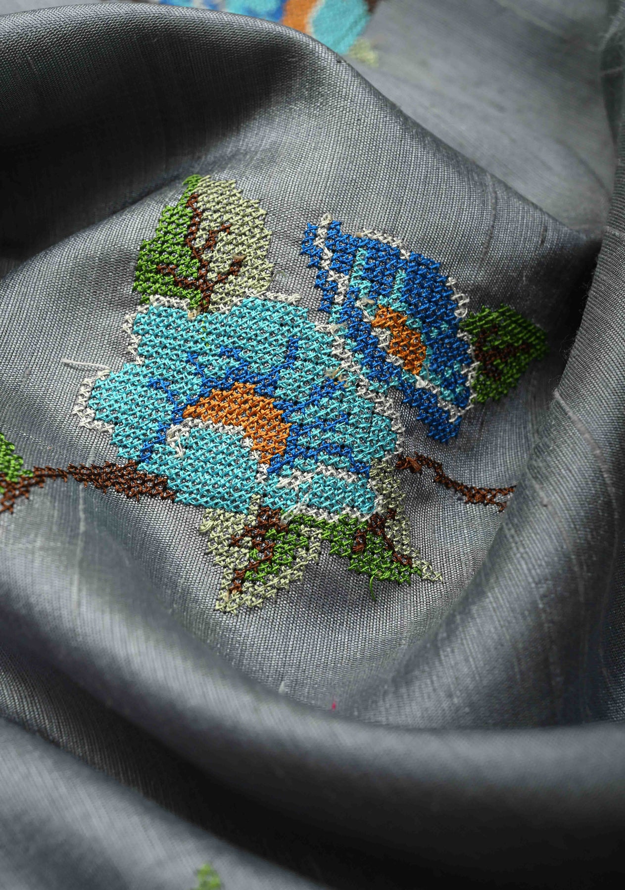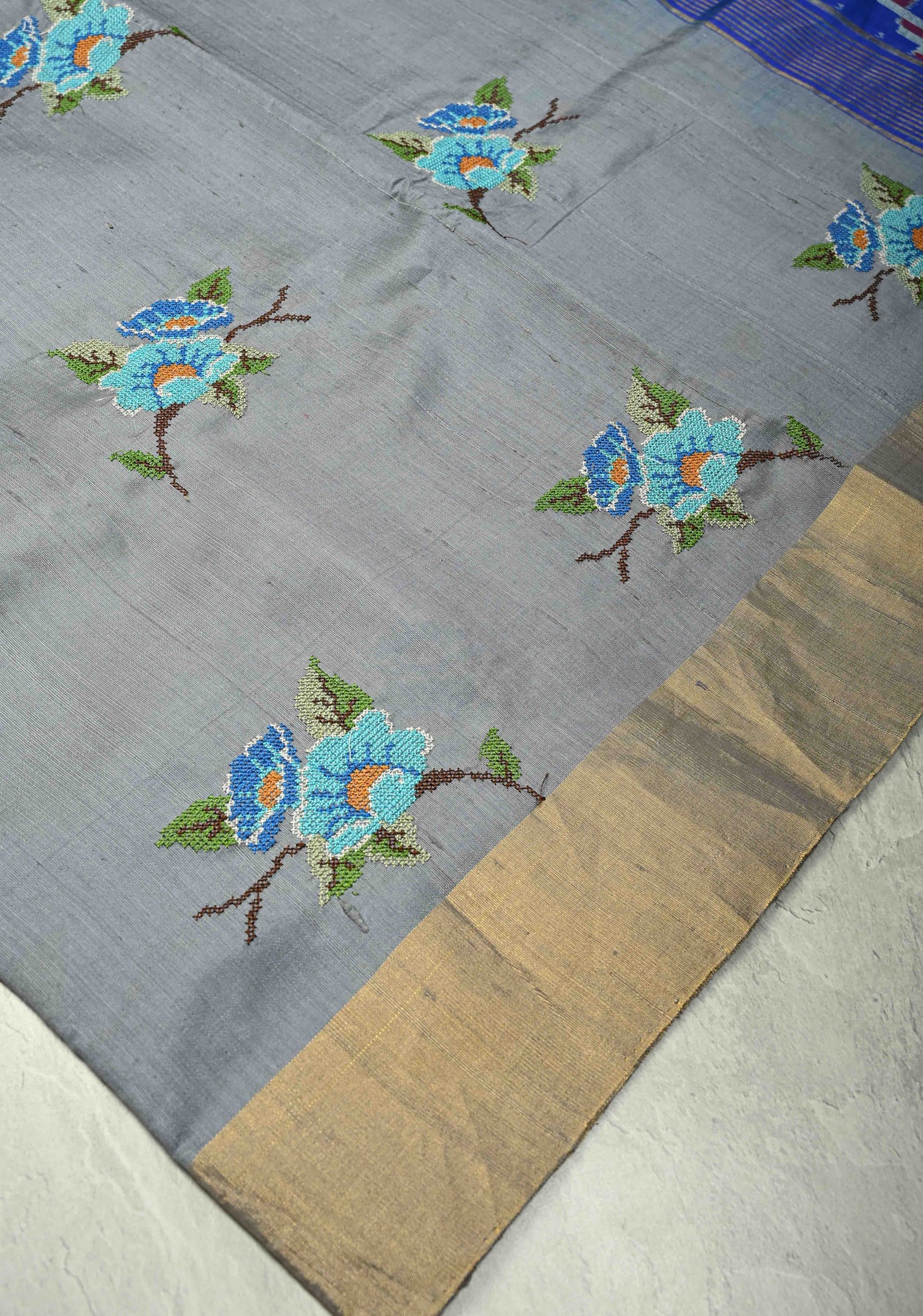 Gray Pure Raw Silk Saree with Cross Stitch Floral Embroidery and Ikkat Pallu, Blouse Piece | SILK MARK CERTIFIED
