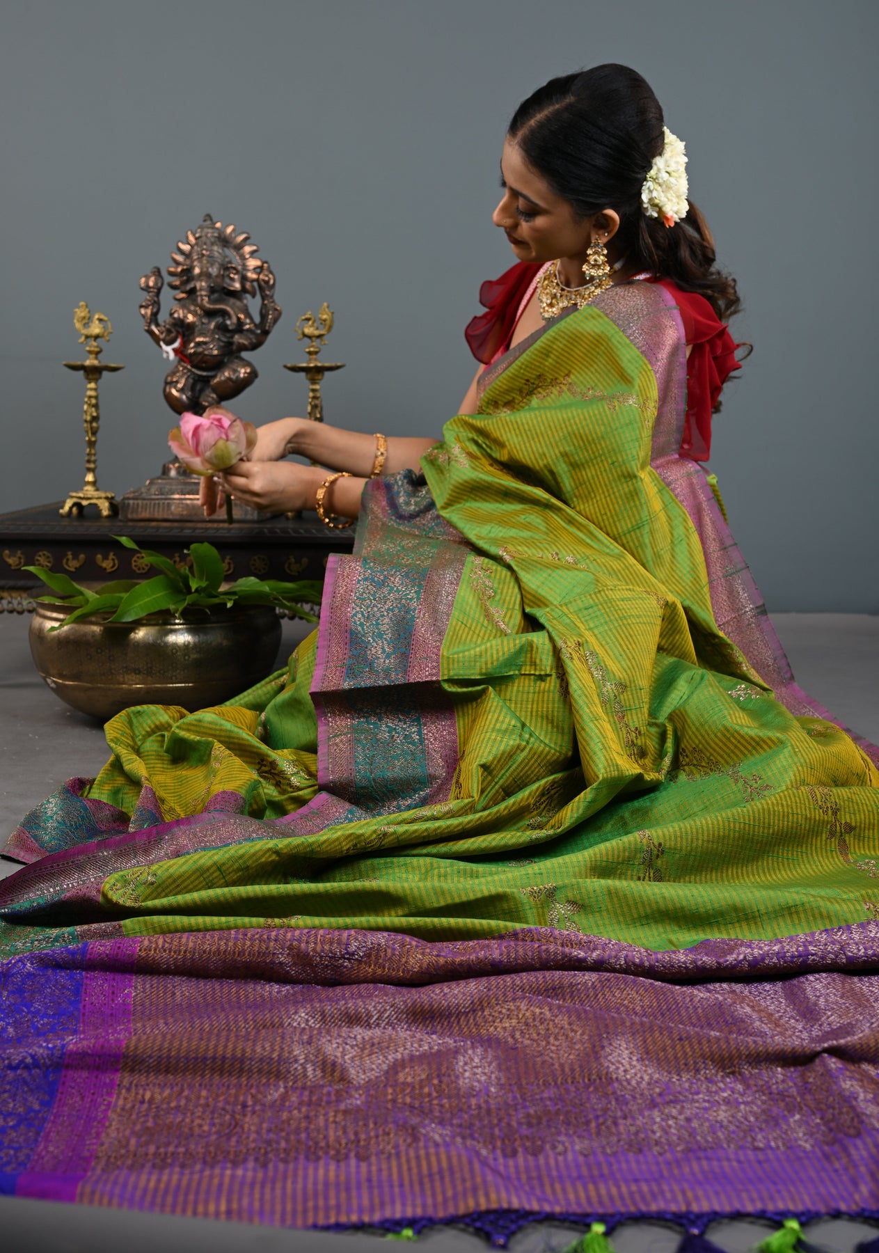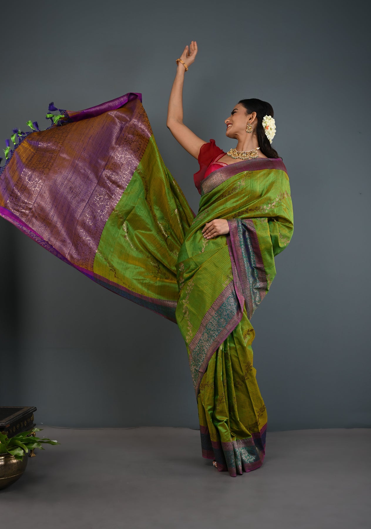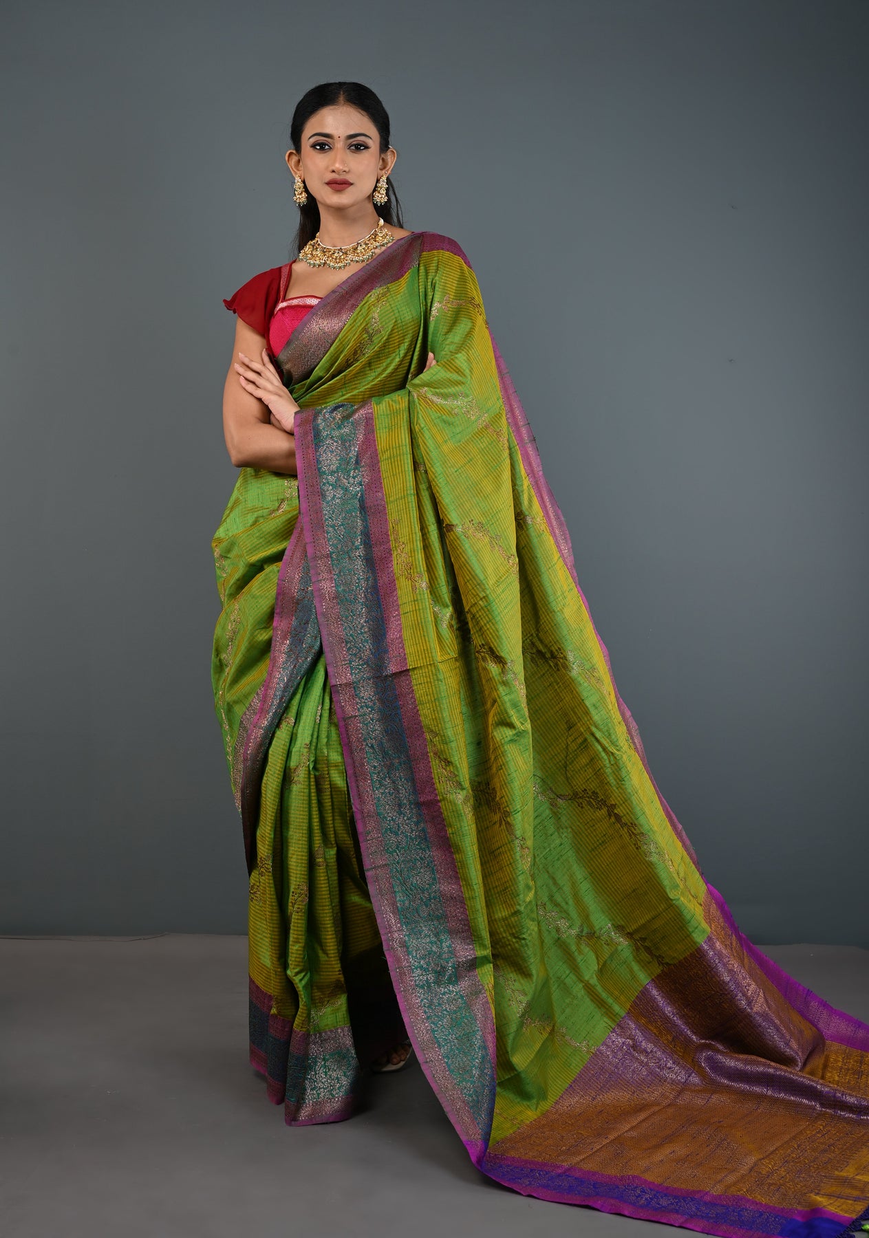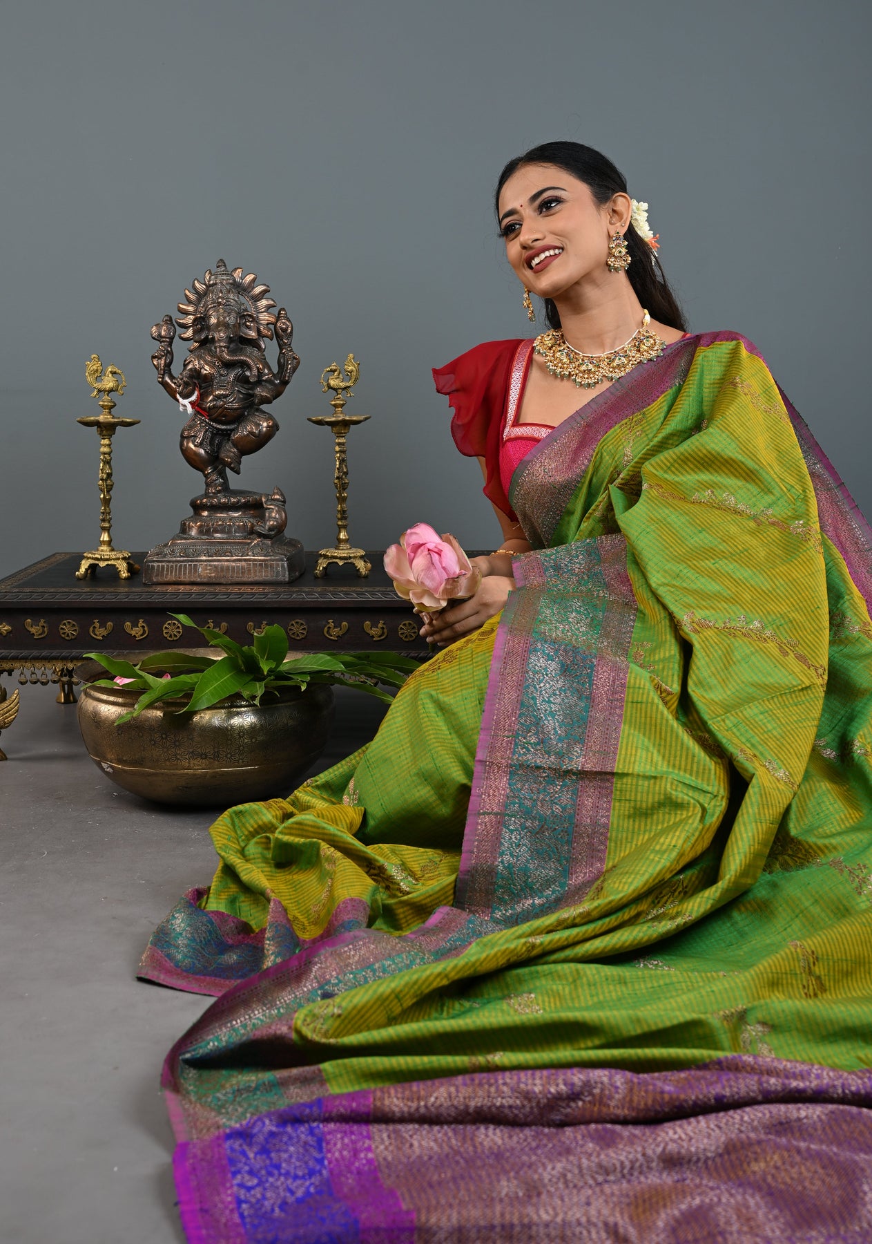 Experience the vibrant elegance of this Green-Yellow Dual Tone Dupion Banarasi Pure Silk Saree, a masterful blend of rich tradition and striking color play. Woven from dupion silk, the saree features the intricate Jungla Leheria Jaal pattern—an exquisite wave motif symbolizing fluidity and grace—woven meticulously throughout the fabric. The dual-tone effect enhances the saree’s depth and allure, shifting beautifully between green and yellow hues as it moves. Complemented by shimmering zari borders, this saree is perfect for festive occasions, weddings, and grand celebrations, embodying regal sophistication and timeless artistry.