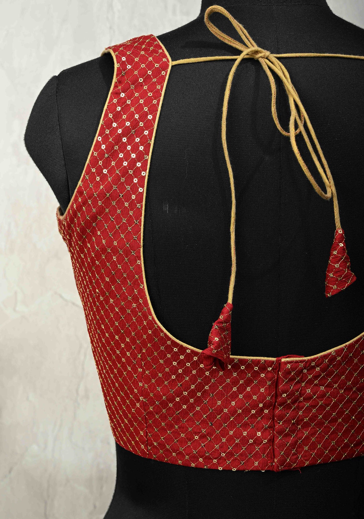 This blood red sleeveless blouse exudes bold elegance with its deep U neckline and contemporary design. Adorned with intricate grid-patterned sequin detailing, it catches the light beautifully, adding a glamorous sparkle to the rich fabric. Perfect for pairing with sarees, lehengas, or skirts, this blouse is an ideal choice for weddings, festive occasions, and evening parties, creating a striking and stylish statement.